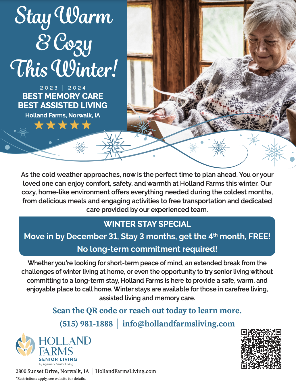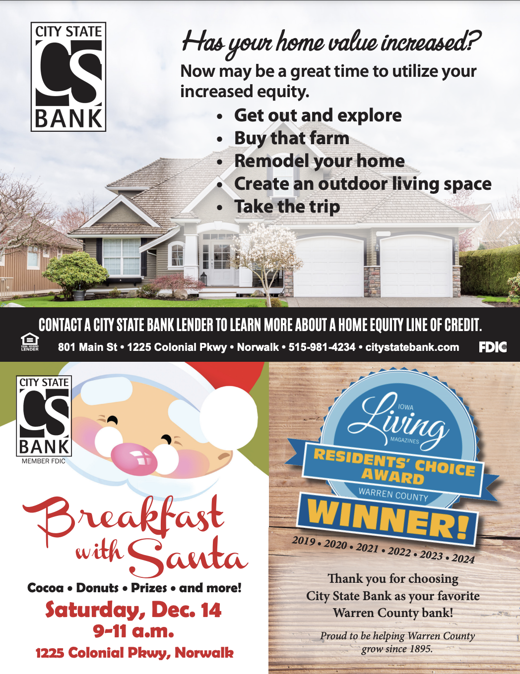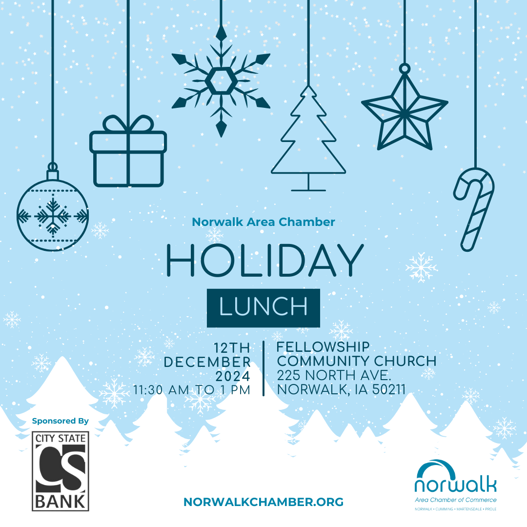 Date: Thursday, December 12, 2025 (add to my calendar) Time: 11:30 AM to 1 PM Location: Fellowship Community Church, 225 North Avenue, Norwalk, IA 50211 Special Thanks to Our Sponsor, City State Bank