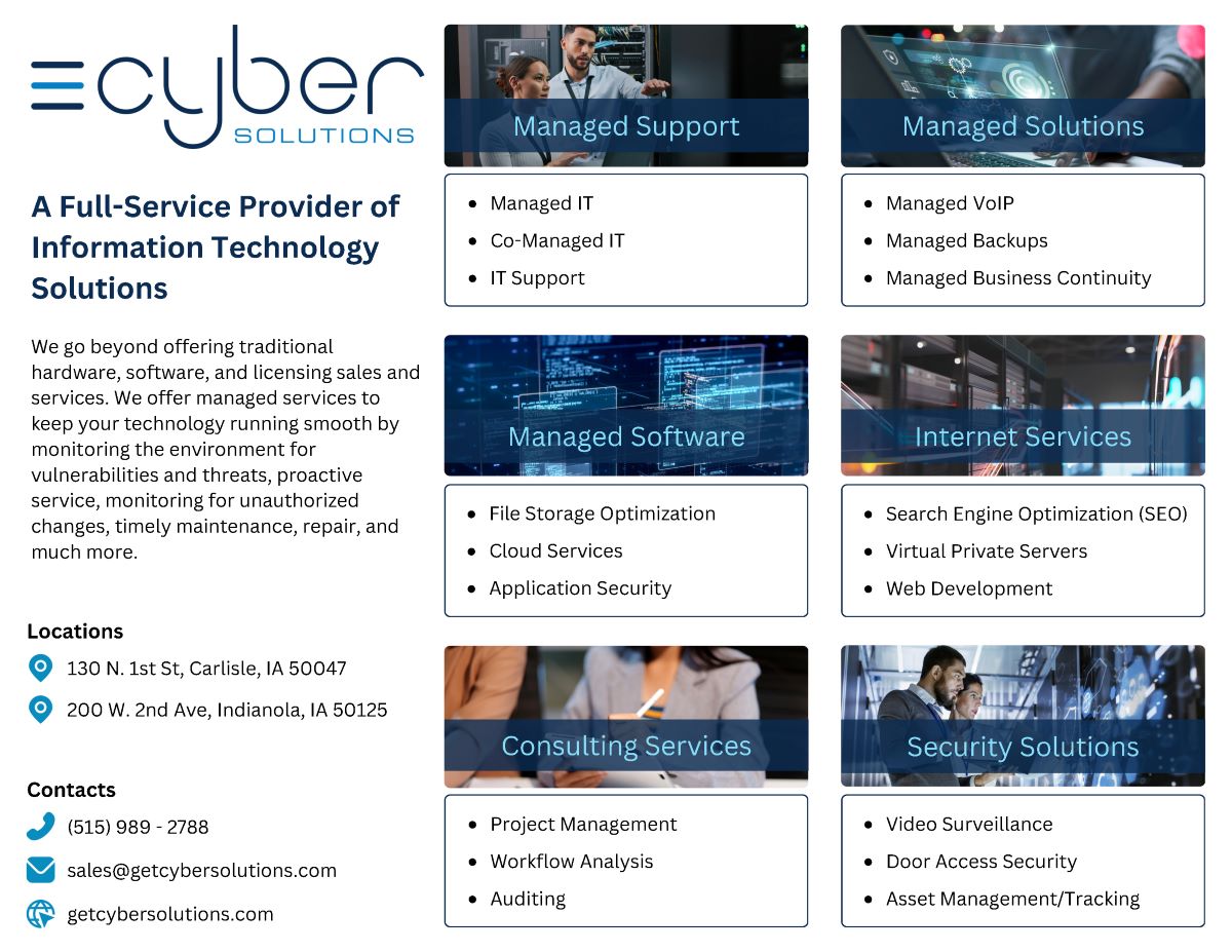 Website: https://getcybersolutions.com/ Email: support@getcybersolutions.com At Cyber Solutions, we offer a comprehensive range of IT services designed to empower individuals and businesses of all sizes. Whether you need reliable support, optimized infrastructure, seamless software management, secure connectivity, strategic guidance, or advanced cybersecurity, our solutions are tailored to meet your unique needs. |