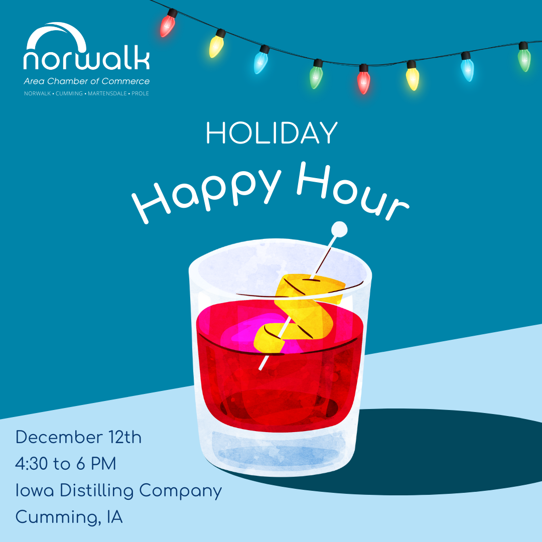 Join us for a fantastic evening of networking and fun at our Holiday Chamber Happy Hour! This event is an excellent opportunity to connect with fellow chamber members and enjoy delicious cocktails. Iowa Distilling Company is hosting a Trivia night following our happy hour event. Members are welcome to stay. Event Details: Date: Thursday, December 12th Time: 4:30 PM - 6:00 PM ($2 off all cocktails) Location: Iowa Distilling Company Event Type: Free Member Event