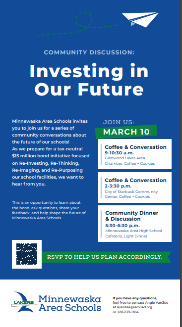 We are seeking 5-10 individuals to be part of this exciting initiative. Applications are open now. Don’t miss this opportunity to get involved and make a difference! To apply or learn more, contact Sara at 320-334-3095 or chamber@glenwoodlakesarea.org. | |