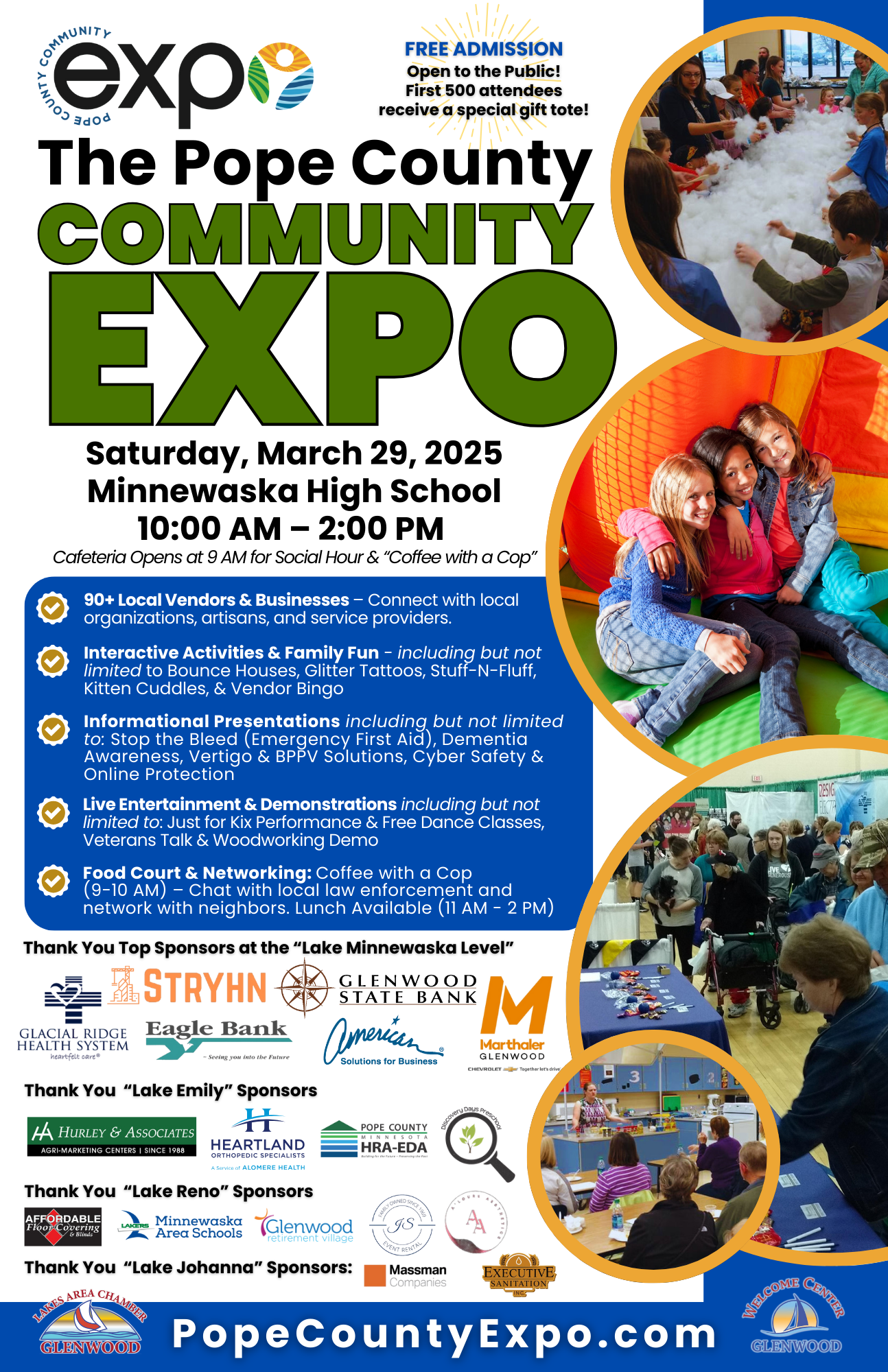 The Pope County Community Expo is just around the corner, happening Saturday, March 29, 2025, at Minnewaska High School from 10 AM – 2 PM! While sponsorships are now closed, we are still accepting vendor registrations—don’t miss this chance to showcase your business! There are a limited amount of spaces remaining.