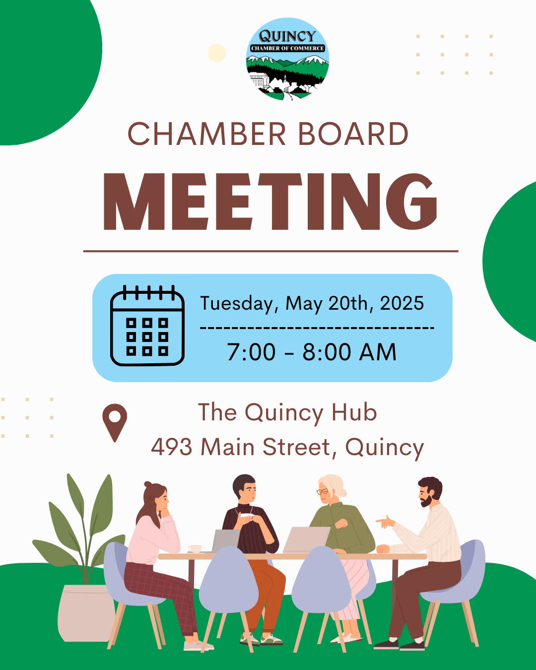 Our next Quincy Chamber of Commerce Board meeting is on Tuesday, May 20th. Would you like to attend, or have a suggestion for the agenda? We'd love your input! Please send us an email at info@quincychamber.com