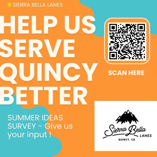 Reservations at required for this great deal just call Sierra Bella Lanes at (530) 283-1633. 11-2 lunch and 5-9 dinner! They are also asking for everyone's input on how to best serve Quincy this summer season. Scan the QR code below to access the survey. |
