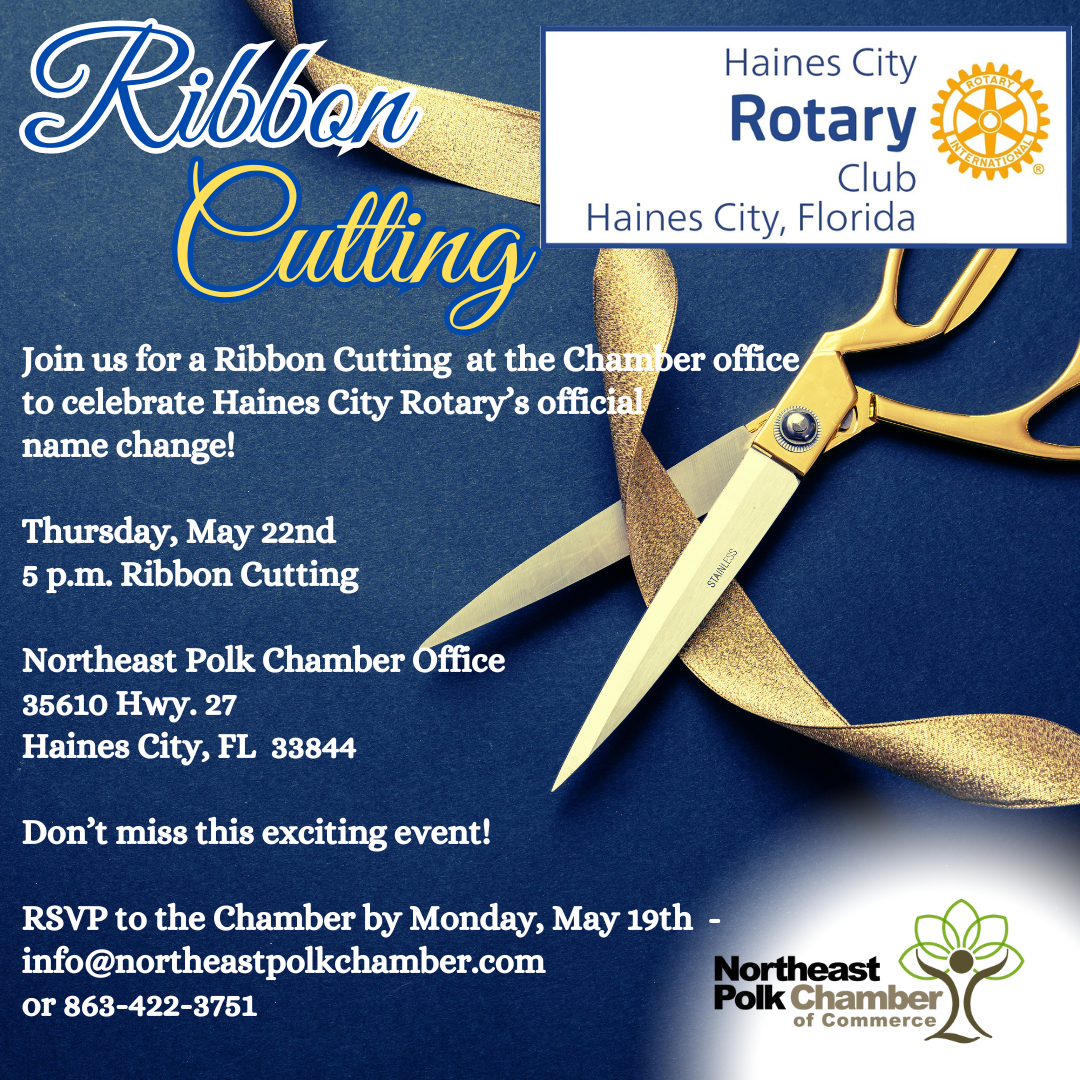 | You are invited to a Ribbon Cutting at the Chamber office to celebrate Haines City Rotary’s official name change! Thursday, May 22nd 5 p.m. Ribbon Cutting