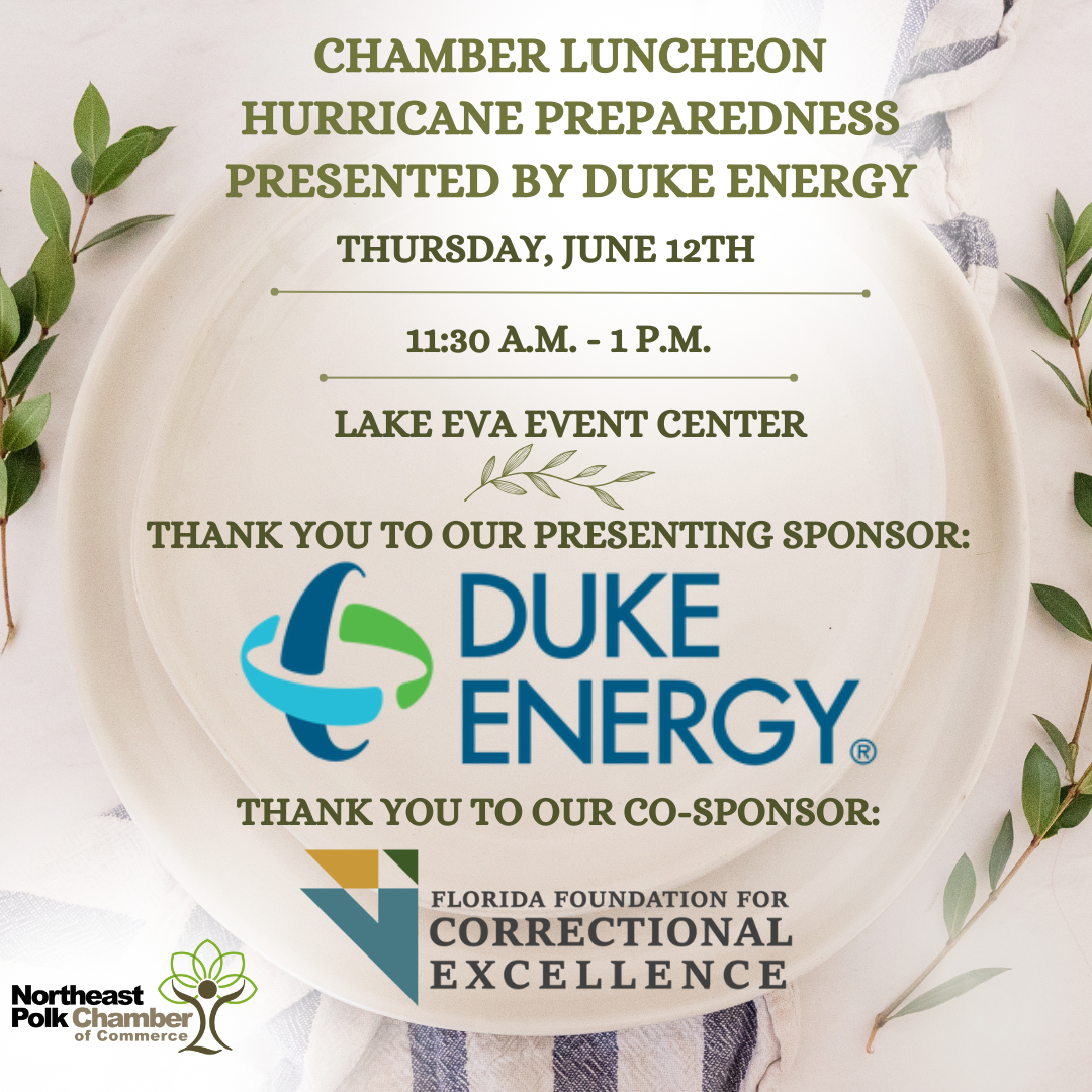 Join us for a Chamber Luncheon featuring a presentation on Hurricane Preparedness from Nancy Dodd, Government & Community Relations Manager at Duke Energy, City of Haines City Fire Chief Cody Donahoe, and City of Haines City Police Chief Jay Hopwood!