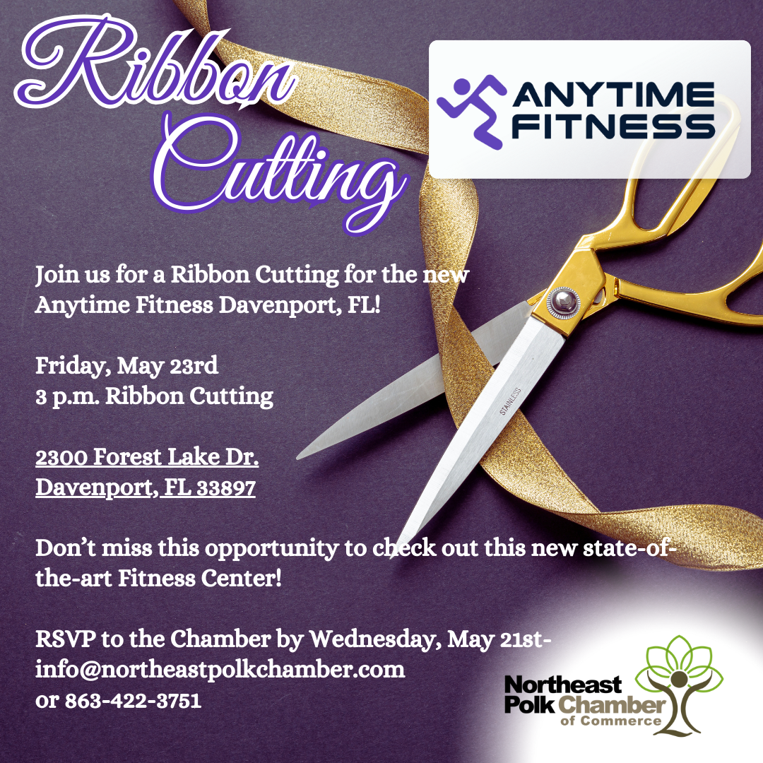 | Join us for a Ribbon Cutting for the new Anytime Fitness Davenport, FL! Friday, May 23rd 3 p.m. Ribbon Cutting