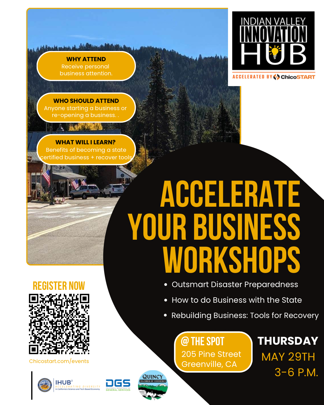The Indian Valley Innovation Hub, accelerated by ChicoSTART, is hosting a series of Accelerate Your Business Workshops specifically designed to provide you with the tools and knowledge you need to navigate the complexities of recovery and set a stronger foundation for the future. This is a chance to get personal attention for your business, connect with others facing similar challenges, and gain practical insights on how to move forward.