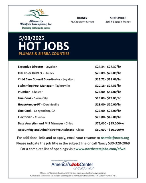 Plumas Rural Services has several job openings. For a complete listing, stop by their office at 711 E. Main Street in Quincy. |