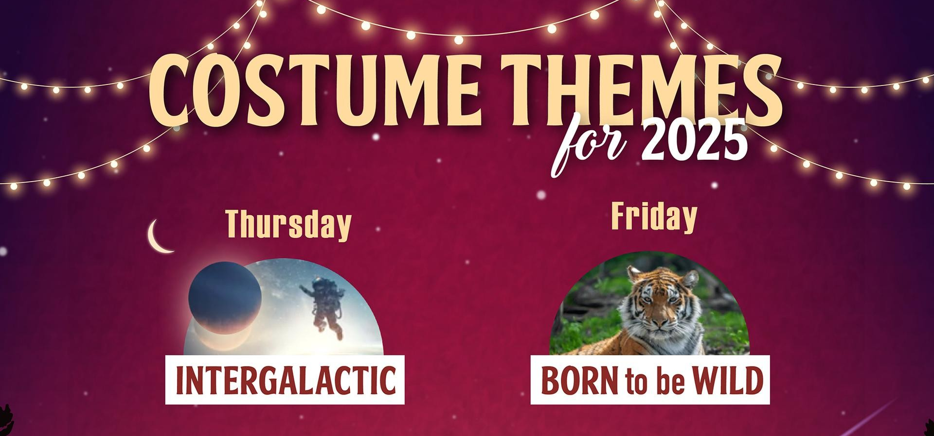 Blast off into the cosmos for Intergalactic Thursday! It's time to suit up, space cadets—whether you're channeling a sleek alien explorer, a daring astronaut, or a glittering galactic queen, the universe is your runway. Think silver, neon, and star-studded styles as we transform the festival into a futuristic space odyssey. From light-up accessories to cosmic makeup, let your imagination soar among the stars. Get ready for an out-of-this-world experience! |
