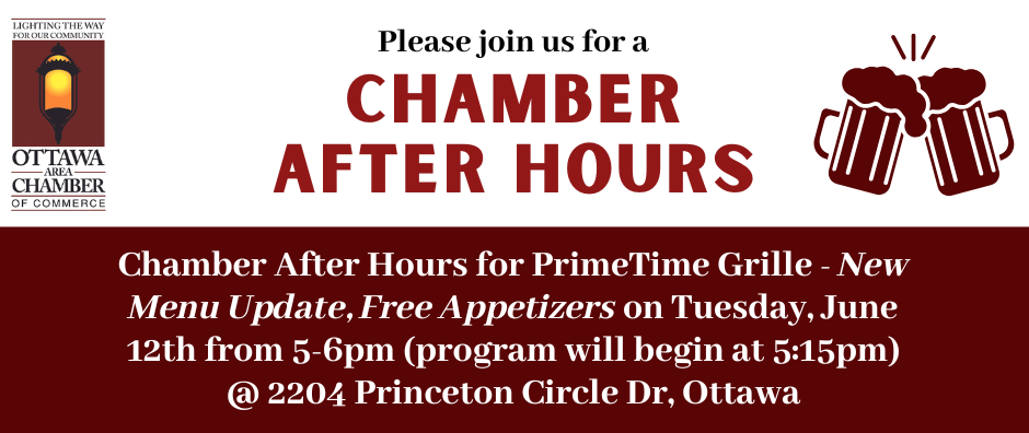 June 12 - 5pm, Chamber After Hours - PrimeTime Grille: New Menu Update, Free Appetizers (Semi-Annual Event) @ 2204 S Princeton Circle Dr, Ottawa