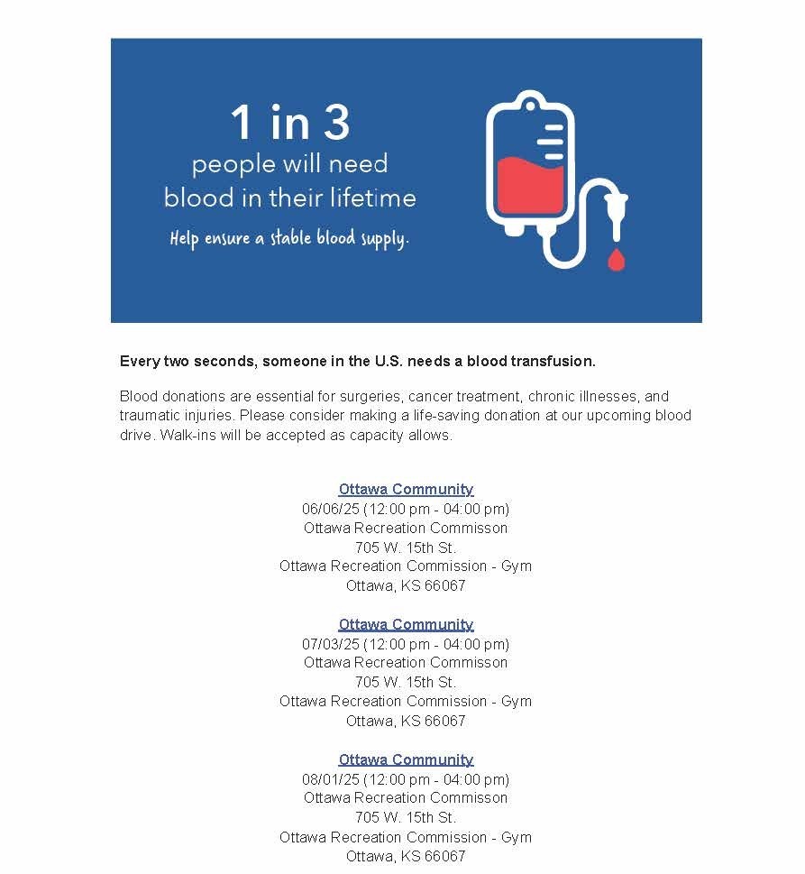 | Are you a friendly and enthusiastic person interested in helping the Red Cross save lives? If you have a little free time and are a true “people person,” we have a great volunteer position for you. Volunteer Blood Donor Ambassadors ensure blood donors have a pleasant and fulfilling experience, from the moment they arrive to when they leave. With plenty of flexible volunteer opportunities, you can sign up to help with blood drives that fit your schedule. Visit redcross.org/volunteer or text/call 785-250-6231. |