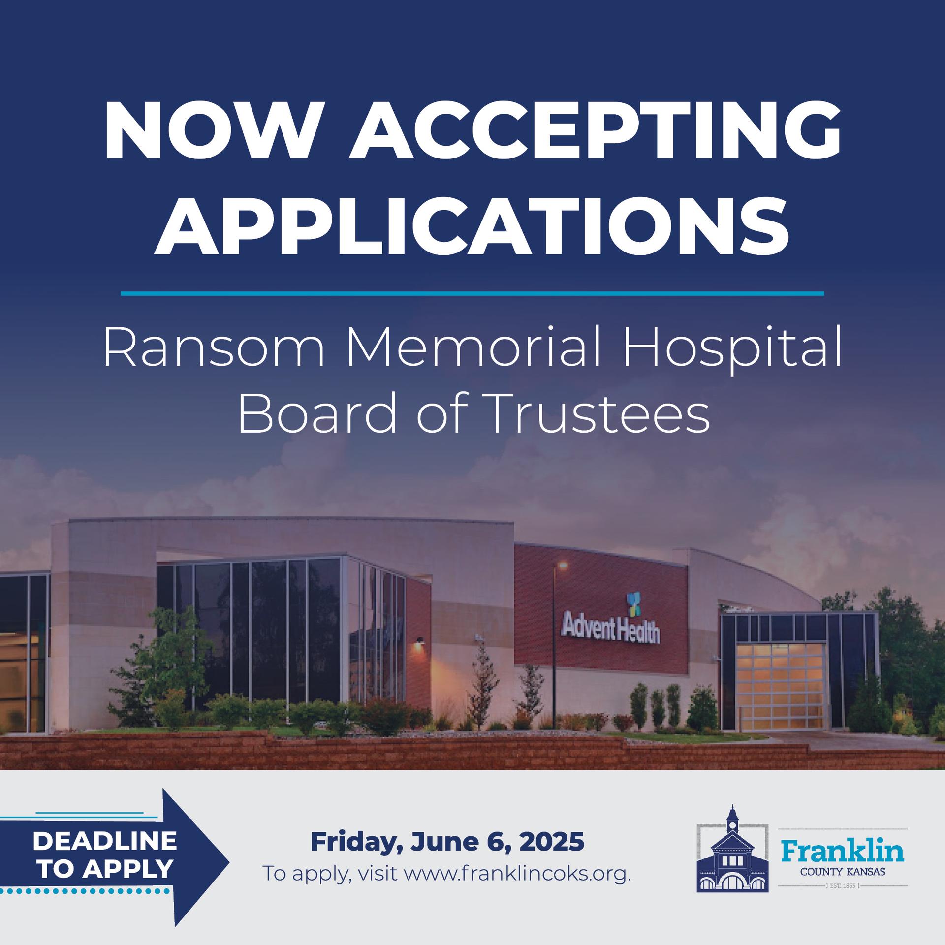 The Franklin County Board of County Commissioners is accepting applications for one (1) position on the Ransom Memorial Hospital Board of Trustees. To learn more or submit an application, click the button below. Application deadline: Friday, June 6, 2025. |