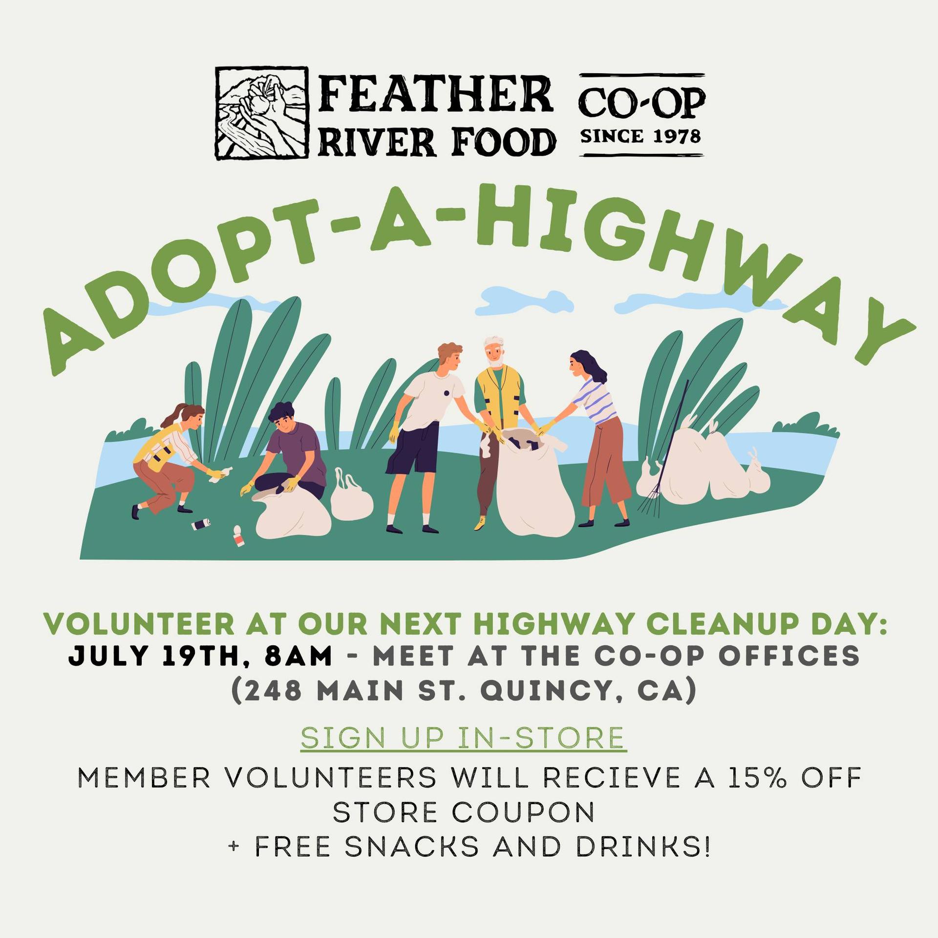 Highway Cleanup Day is This Saturday Join the Feather River Food Co-Op for a morning of fresh air and community spirit at the next Highway Cleanup Day.