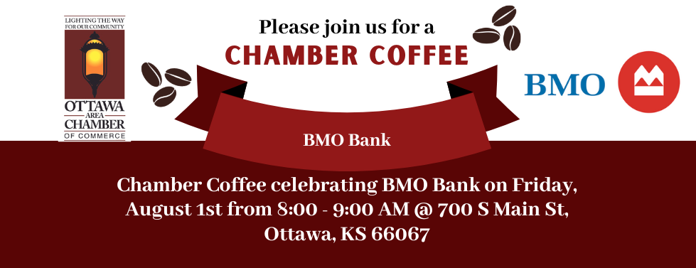 August 1st - 8am Chamber Coffee for BMO Bank @ 700 S Main St, Ottawa. August 8th - 8am Chamber Coffee for Southern Star Central Gas Pipeline @ 3231 Nebraska Rd, Ottawa.