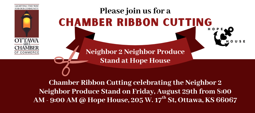August 29th - 8:00am Chamber Ribbon Cutting for Neighbor 2 Neighbor Produce Stand @ Hope House, 205 W. 17th St, Ottawa. September 1st - Chamber Office Will Be Closed in Honor of Labor Day.
