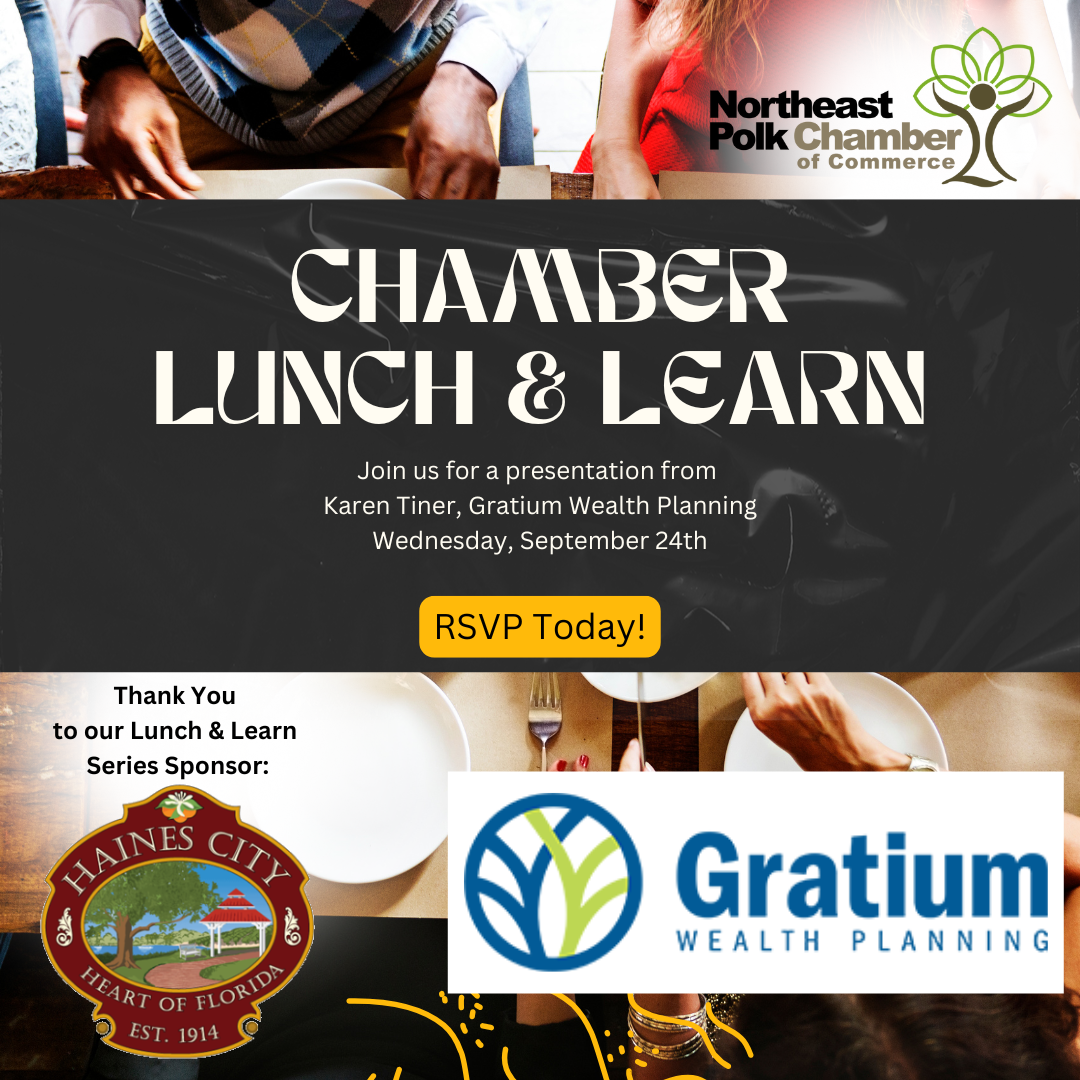 Date: Wednesday, September 24th Time: 12 noon - 1 p.m. Location: Chamber Office, 35610 Hwy. 27, Haines City *FREE for Chamber Members; $10 for Non Chamber Members