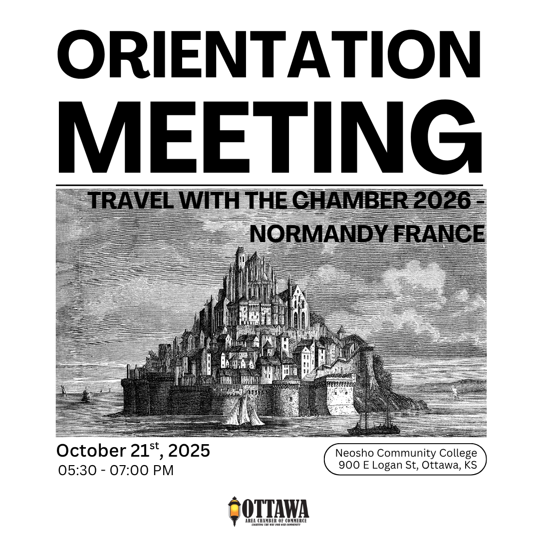 October 21st - 5:30 - 7:00 p.m. - Travel With The Chamber to Normandy France 2026 Orientation Meeting @ NCCC @ 900 E. Logan St, Ottawa.