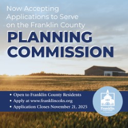 Franklin County has a vacancy on the Planning Commission, a board that plays a key role in shaping the County’s future. By serving, you will help guide growth and development, ensuring it aligns with the community’s long-term vision and goals. If you are interested, you can apply by clicking the button below. Applications are due by 5 p.m. on Friday, November 21, 2025. |