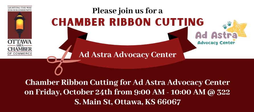 October 24th - 9:00 am, (be aware that this is a later start time than usual), Chamber Ribbon Cutting for Ad Astra Advocacy Center @ 322 S. Main St, Ottawa. October 28th - 5:00 pm, Chamber After Hours / Ribbon Cutting for Angels Care Home Health @ 318 S. Main St, Ottawa.