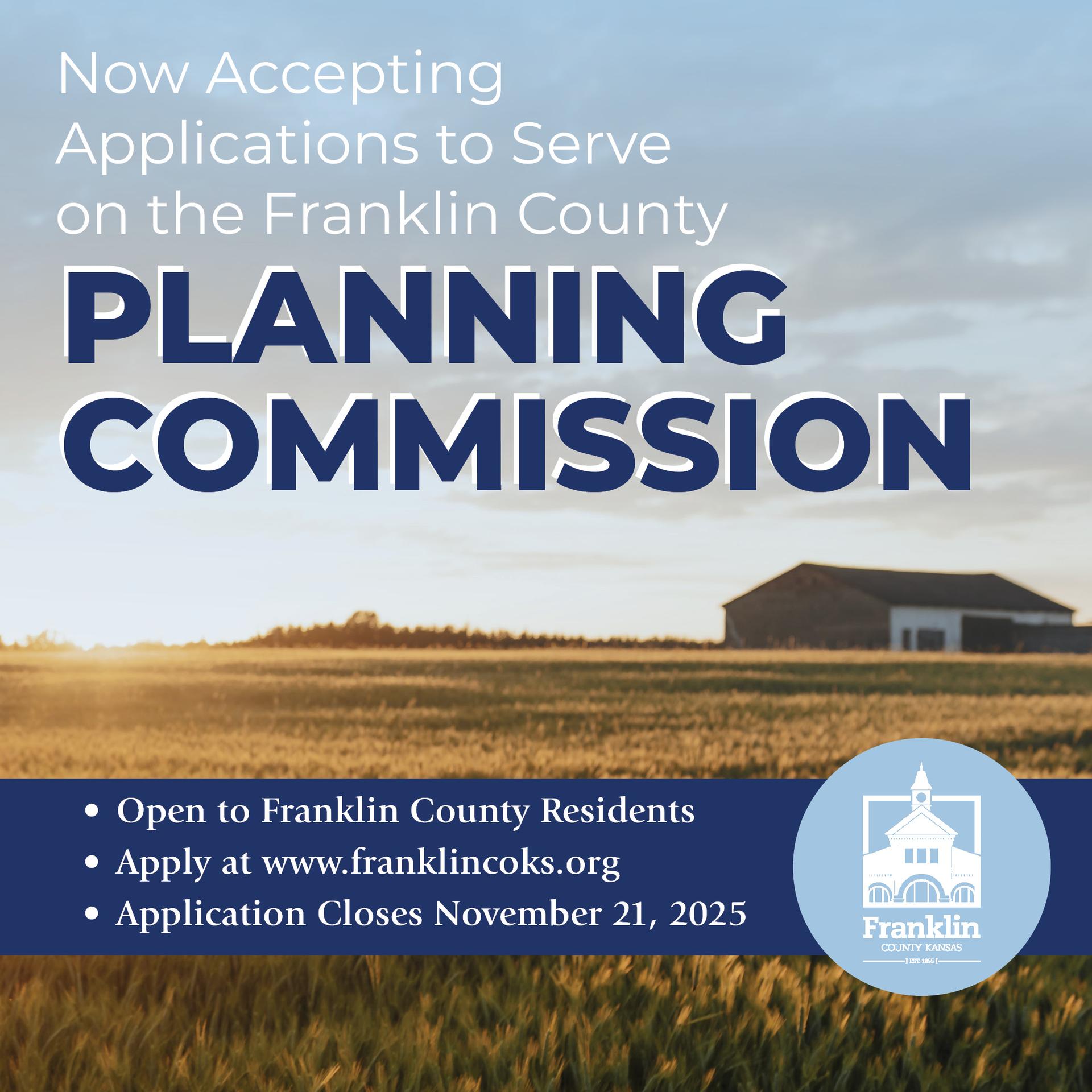 Franklin County has a vacancy on the Planning Commission, a board that plays a key role in shaping the County’s future. By serving, you will help guide growth and development, ensuring it aligns with the community’s long-term vision and goals. If you are interested, you can apply by clicking the button below. Applications are due by 5 p.m. on Friday, November 21, 2025. |