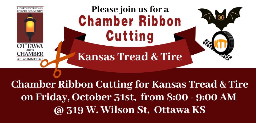 October 31st - 8:00 am, Chamber Ribbon Cutting for Kansas Tread & Tire @ 319 W. Wilson St, Ottawa. (Open House All Day to Follow).