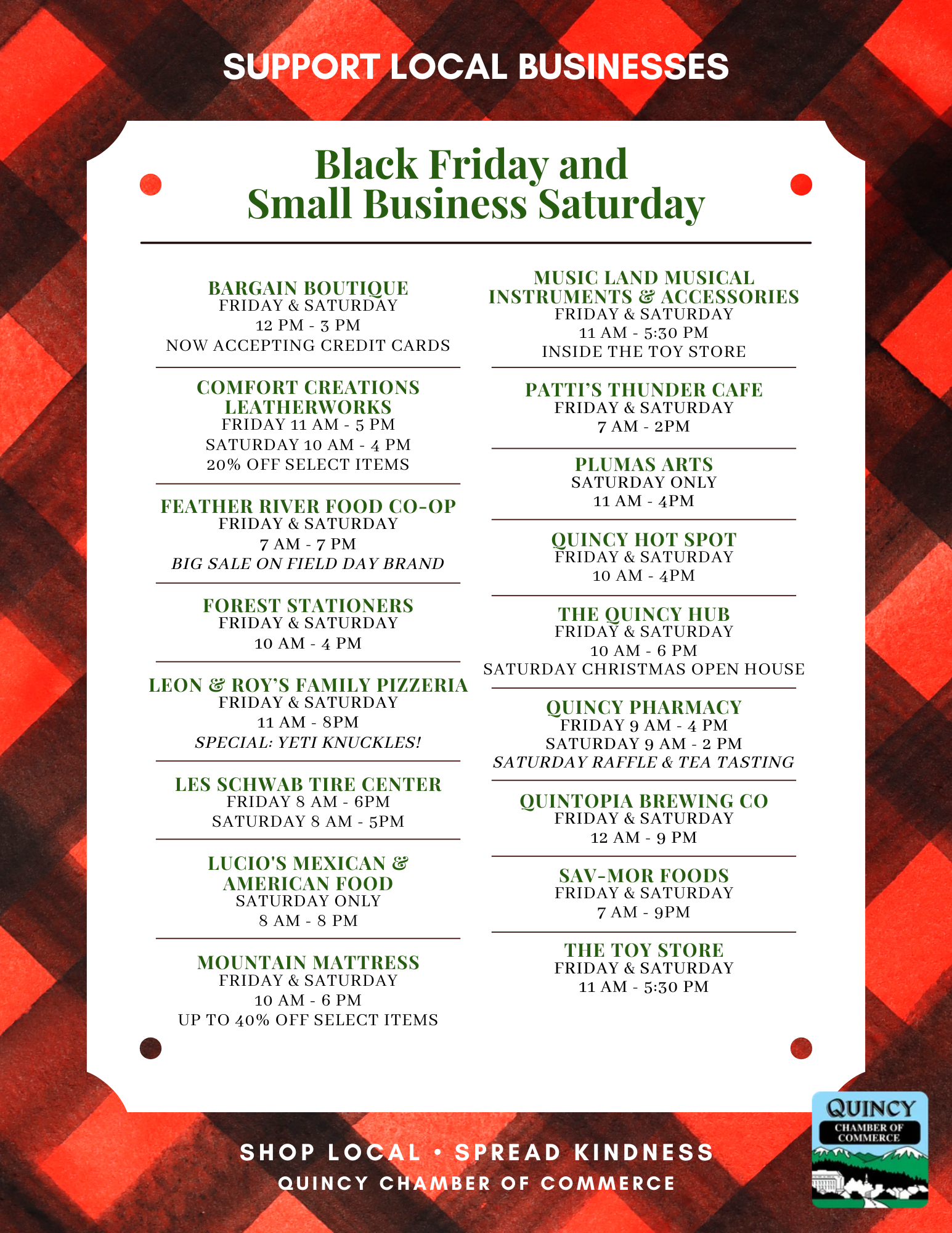 Plan Your Weekend Strategy: From breakfast at Patti’s Thunder Cafe to late-night bites at Quintopia, Quincy is open for business. Be sure to check the flyer for specific hours, as some spots like Lucio’s and Plumas Arts have special schedules!