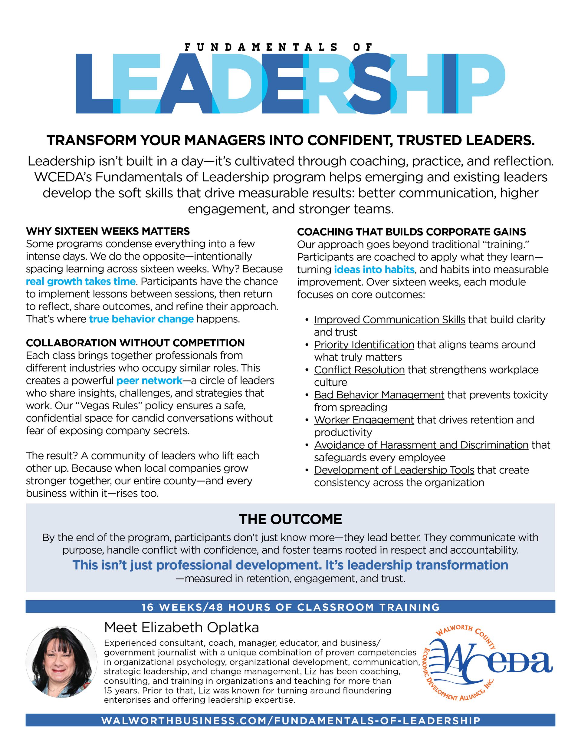 Leadership isn’t built in a day—it’s cultivated through coaching, practice, and reflection. WCEDA’s Fundamentals of Leadership program helps emerging and existing leaders develop the soft skills that drive measurable results: better communication, higher engagement, and stronger teams. Our approach goes beyond traditional “training.” Participants are coached to apply what they learn—turning ideas into habits, and habits into measurable improvement. Over sixteen weeks, each module focuses on core outcomes:
