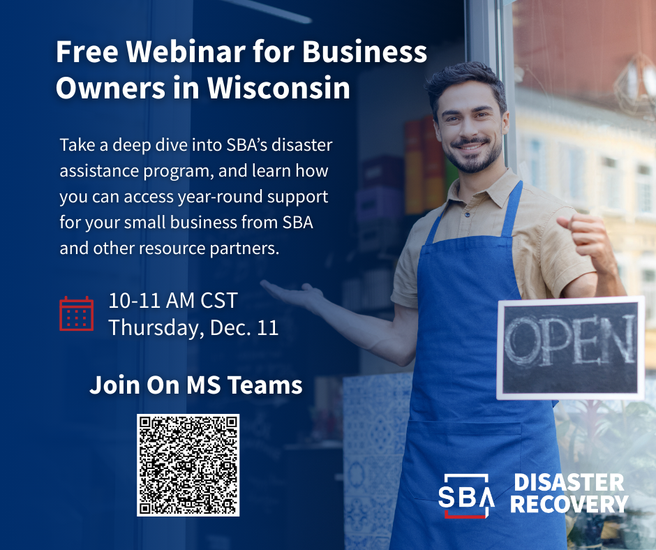 Free Webinar for business owners to learn more about disaster assistance programs from SBA and other resource partners. Click the following link for more information and to register. [Learn More] |