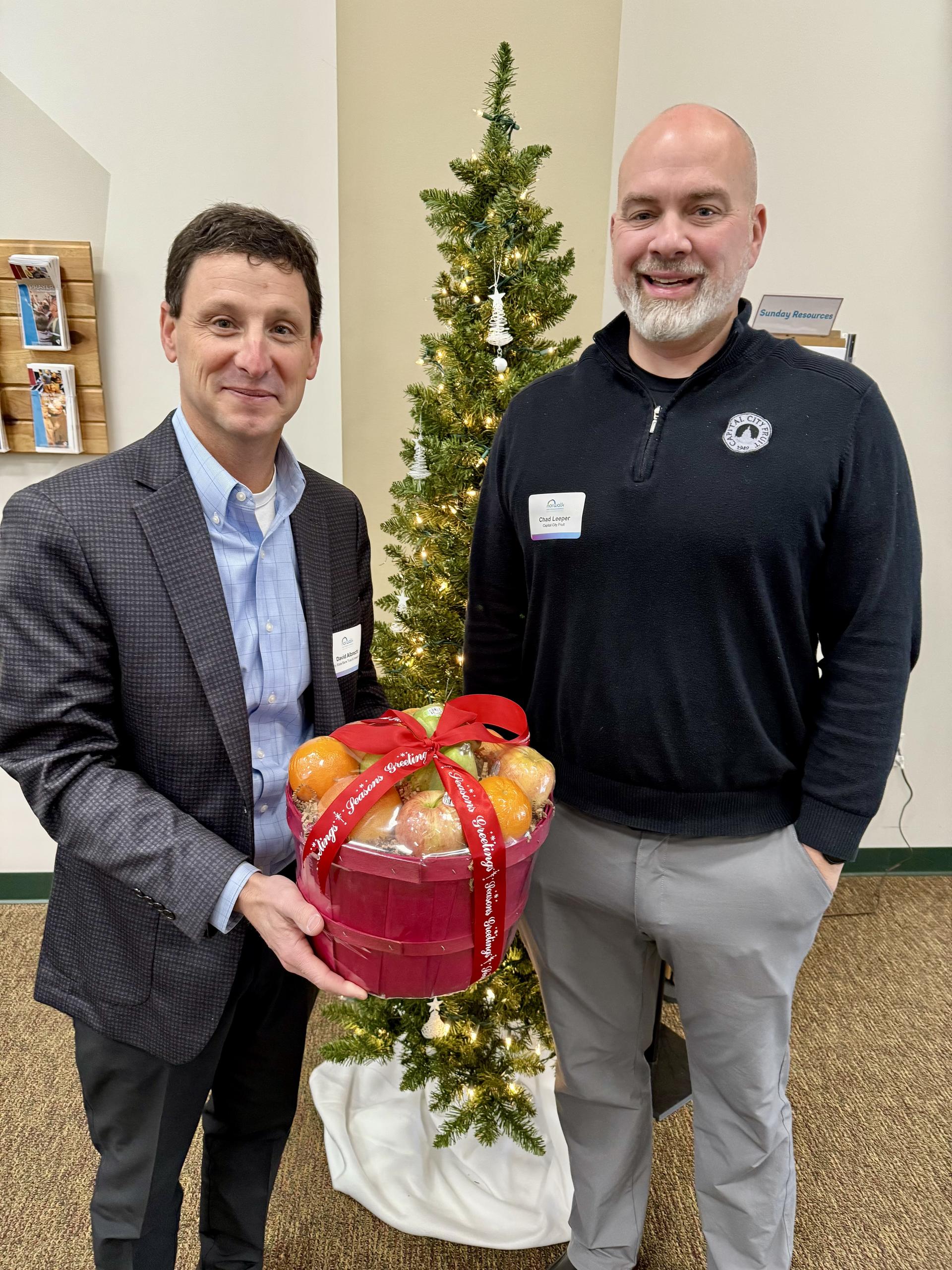 David Albrecht winning a beautiful gift basket from Chad Leeper, Capital City Fruit. |