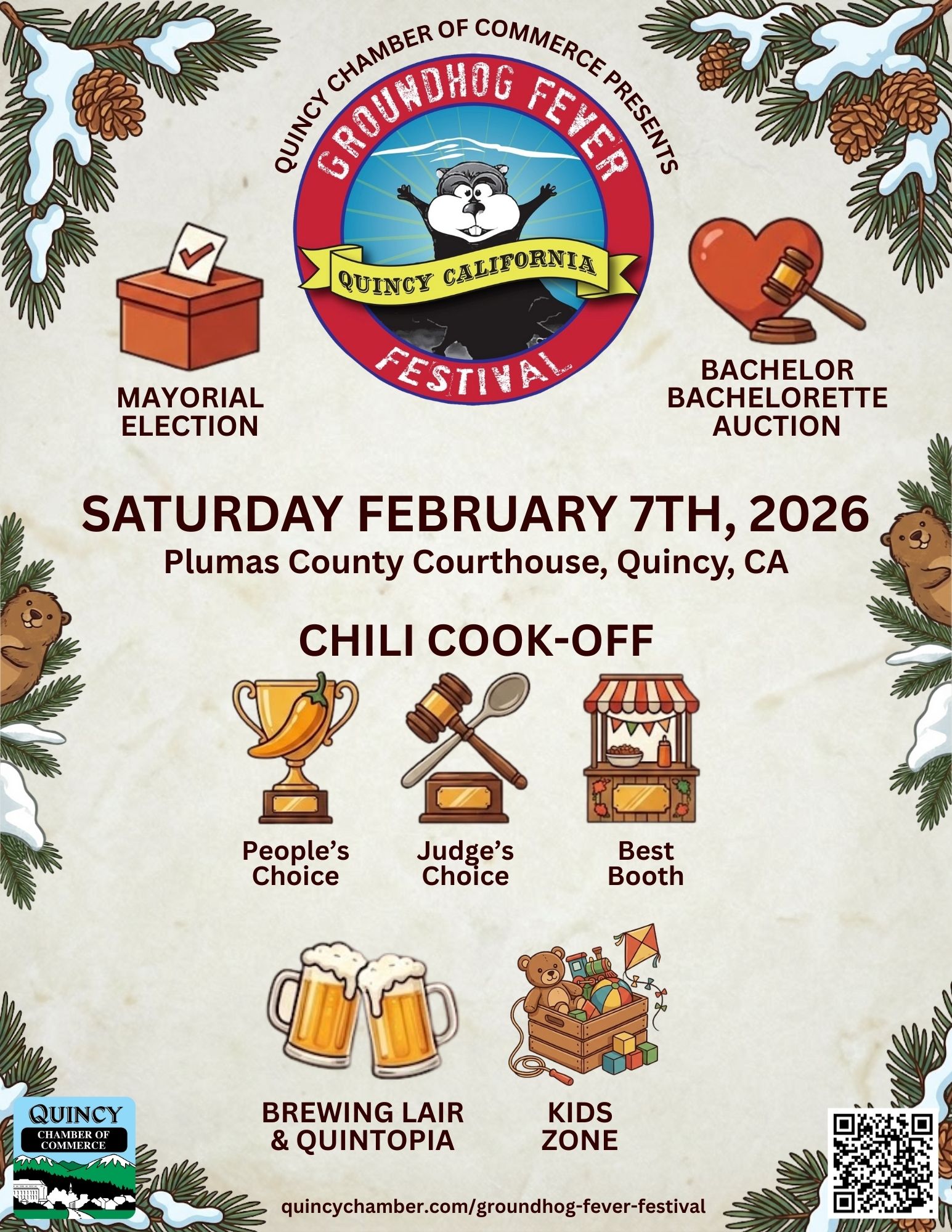 The Groundhog Fever Festival returns to the Plumas County Courthouse in Quincy on Saturday, February 7th, 2026, and this year’s lineup is packed with community favorites!