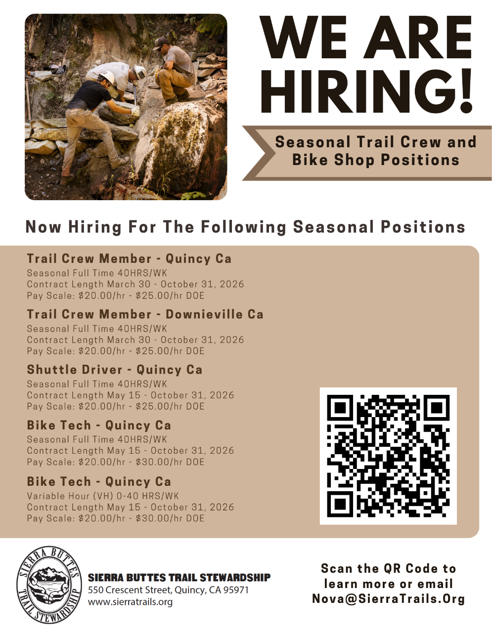 Open Positions: - Trail Crew Member (Quincy & Downieville): Seasonal Full-Time (40 hrs/wk). Contract runs March 30 – Oct 31, 2026. Pay: $20.00 – $25.00/hr DOE.