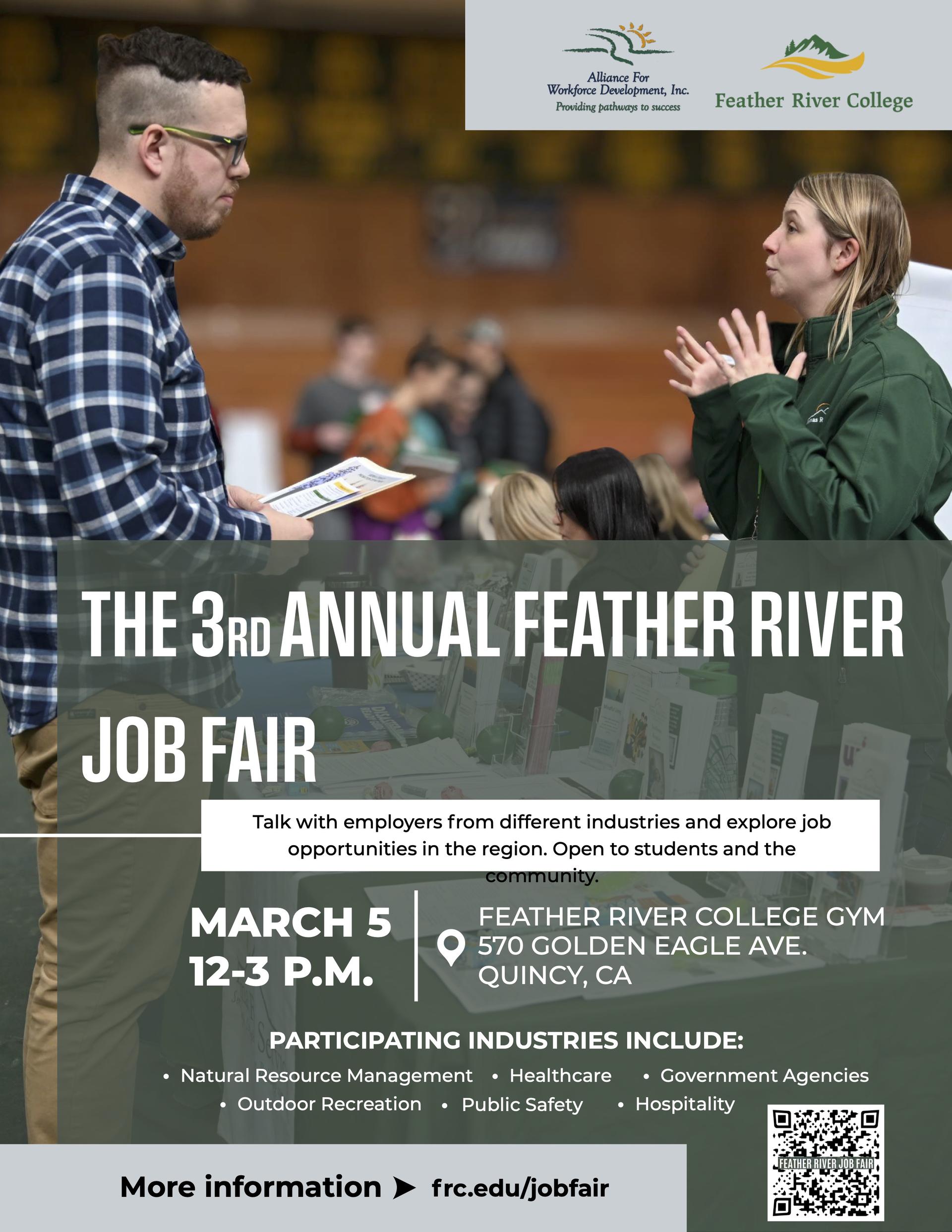 The Alliance for Workforce Development (AFWD) and Feather River College (FRC) are excited to announce the 3rd Annual Feather River Job Fair, scheduled for March 5th. This event is a premier opportunity for local job seekers to connect with employers from diverse industries and explore career paths within our region. For Job Seekers The fair is open to both students and the general community. Attendees can expect to meet with representatives from a wide range of sectors, including: - Healthcare