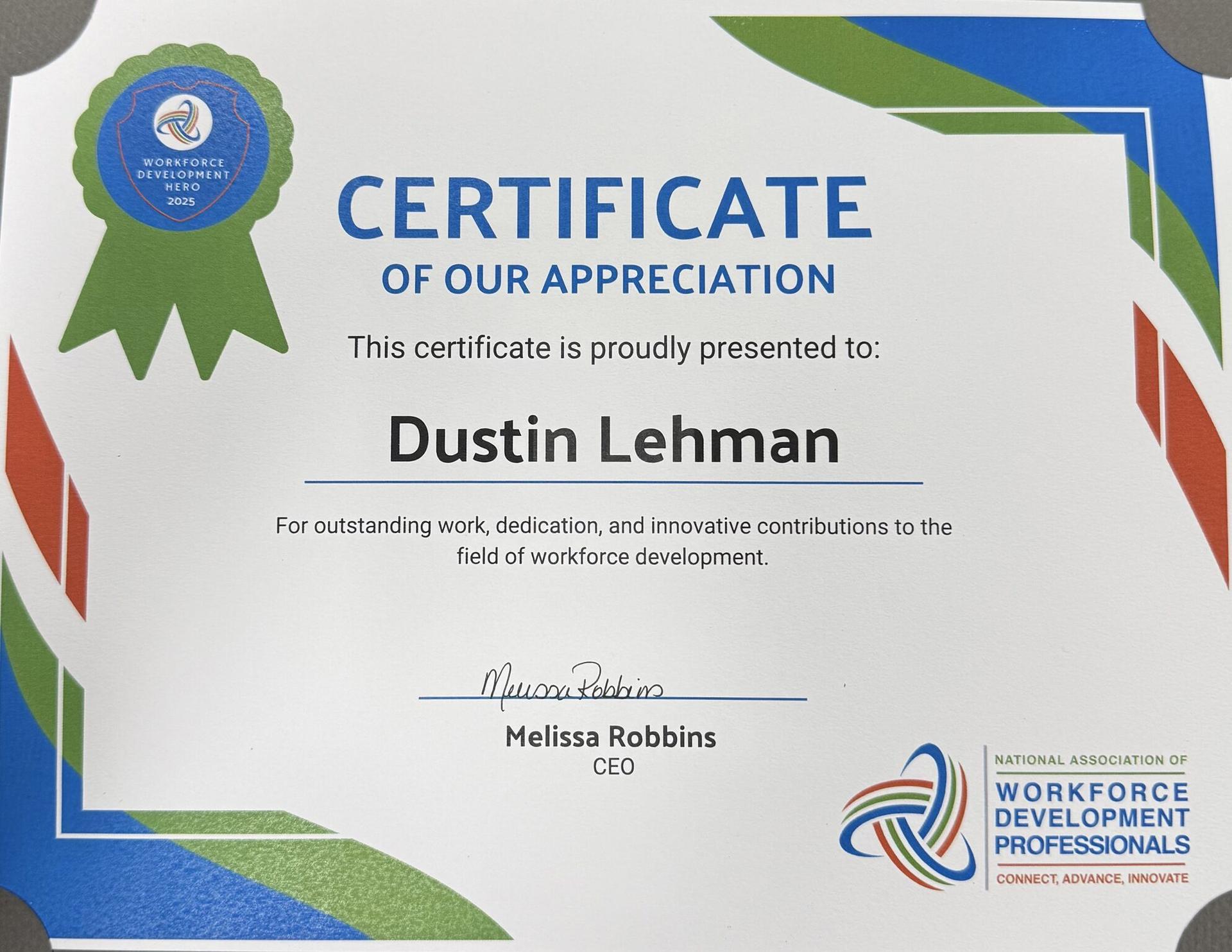 Dustin Lehman, Director of Strategic Partnerships for Elkhorn Area School District was honored to be recognized as a 2025 Workforce Development Hero by the National Association of Workforce Development Professionals (NAWDP). According to Lehman, getting students engaged in the workforce early has so many benefits in preparing students for hashtag#PostSecondaryReadiness. On top of the benefits for students, the economic impact on the local community is tremendous!" We couldn't agree more! Congratulations, Dustin!