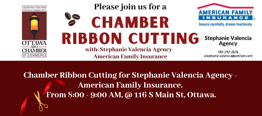 February 13th - 8:00 am, Chamber Ribbon Cutting for Stephanie Valencia, American Family Insurance - come meet the new owner @ 116 S. Main St. Suite A, Ottawa.