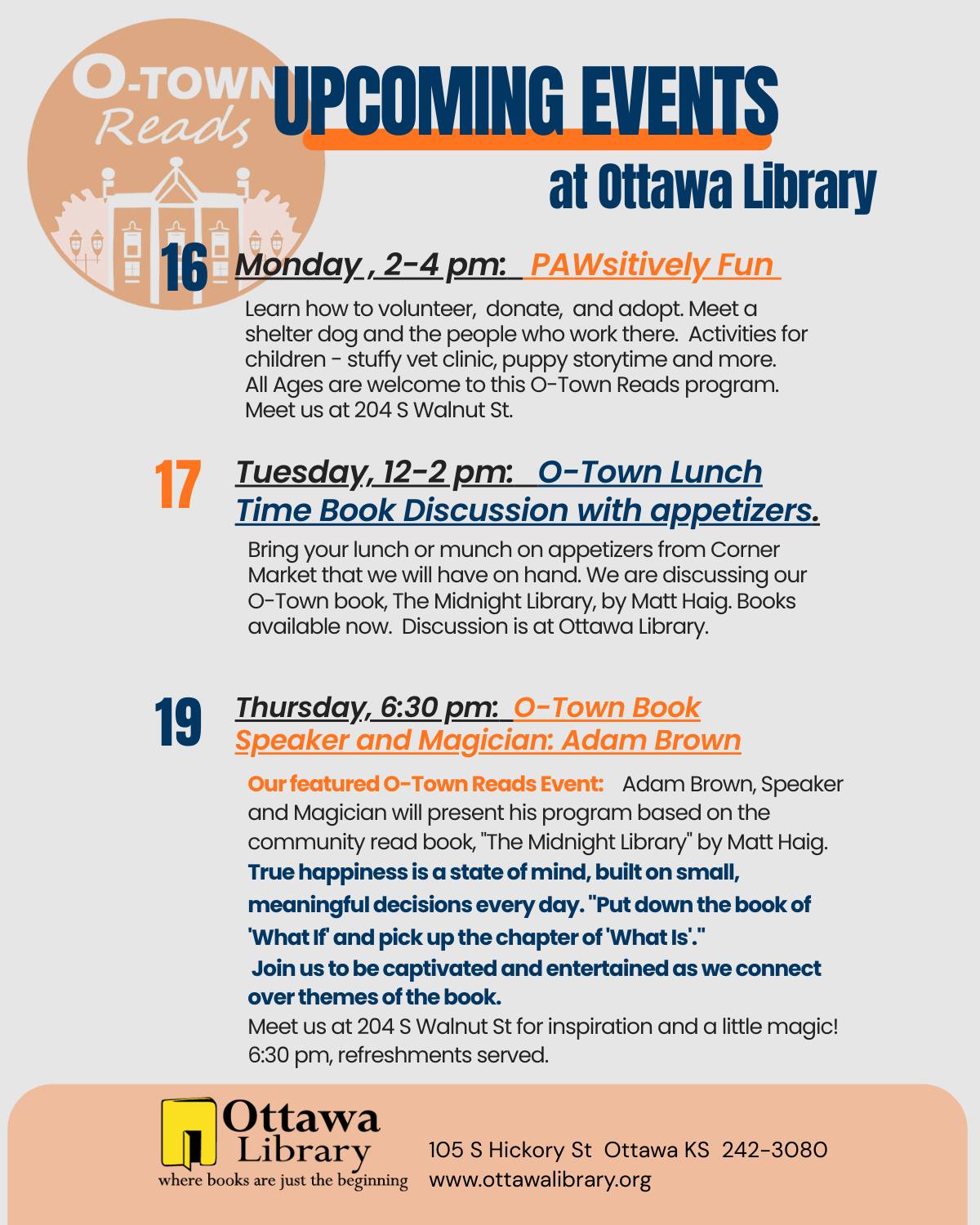 February 20th - 8:00 am, Chamber Ribbon Cutting for Prairie Paws - Learn More About Their New Mobile Spay & Neuter Clinic @ Legacy Square, 125 S. Walnut, Ottawa. February 21st - 10:00 am, Legislative Coffee @ the Ottawa Police Department Courtroom, 715 W. 2nd St, Ottawa.