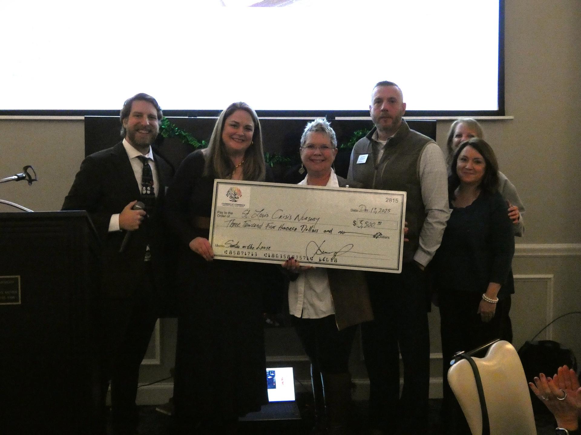 | Santa's on the Loose Committee presents our Charity Partner Check to Saint Louis Crisis Nursery |