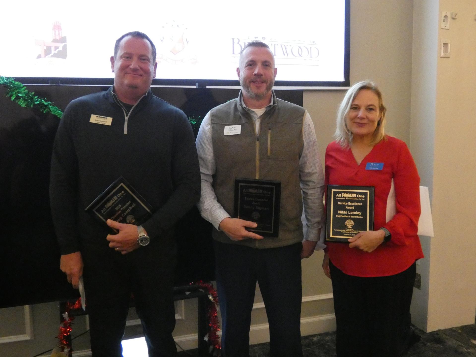 We also extend our heartfelt appreciation to outgoing Board Member & Past President; Nikki Lemley for her service and commitment to the Chamber. Special Recognition: Service Excellence Award: Danny Sigman Past President: Greg Campbell |