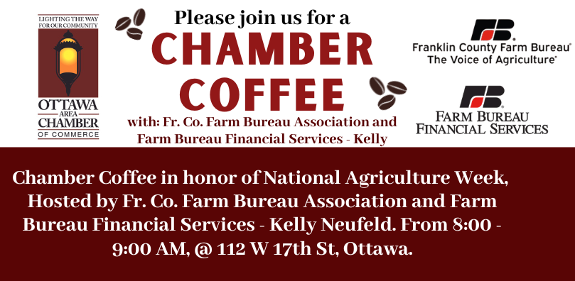 March 20th - 8:00 am, Chamber Coffee for Fr. Co. Farm Bureau Association & Farm Bureau Financial Services - Kelly Neufeld, In Honor of National Agriculture Week @ 112 W 17th St, Ottawa.