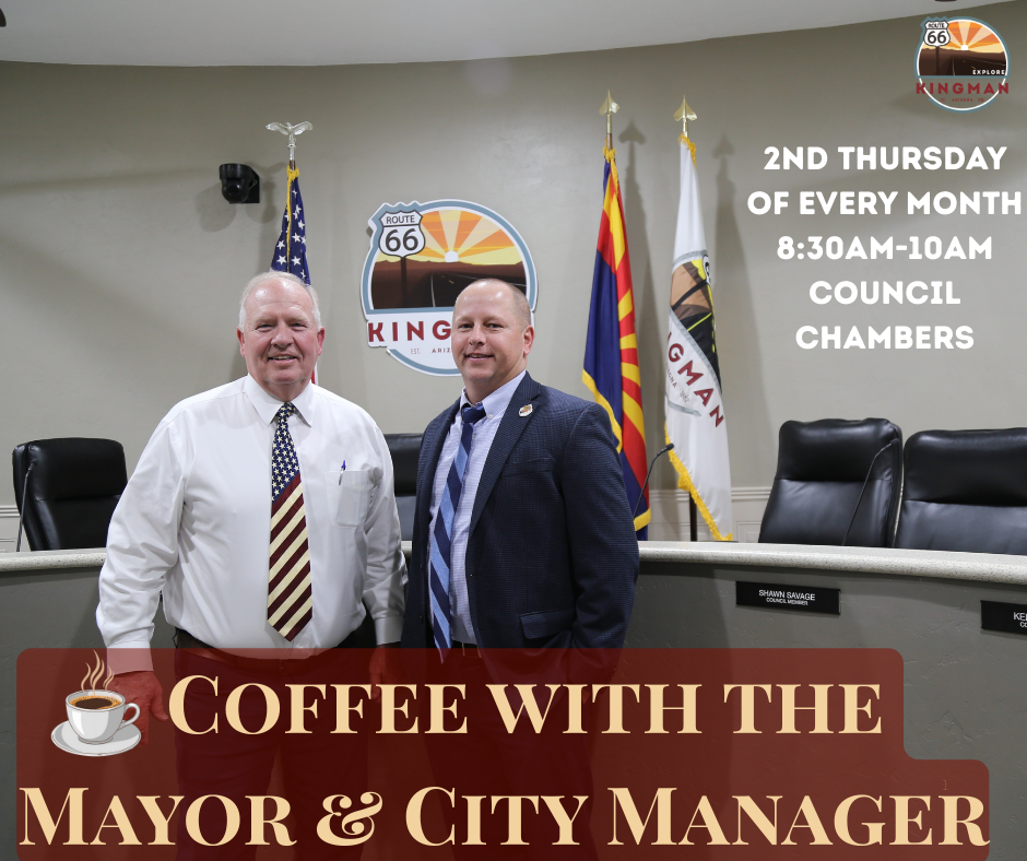 Whether you are a long-time resident or new to the community, Coffee with the Mayor and City Manager is designed to foster meaningful dialogue about what is happening in Kingman. Attendees can learn more about current and future City projects, ask questions, share feedback, and discuss issues or concerns in a relaxed, come-and-go setting. No RSVP is required, and everyone is welcome to stop by at any time during the event window. Free coffee will be provided.