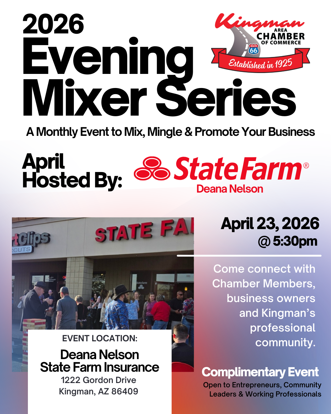 Join the Kingman Area Chamber of Commerce for its April Evening Mixer, hosted by Deana Nelson State Farm Insurance, on Thursday, April 23, 2026, at 5:30 PM.