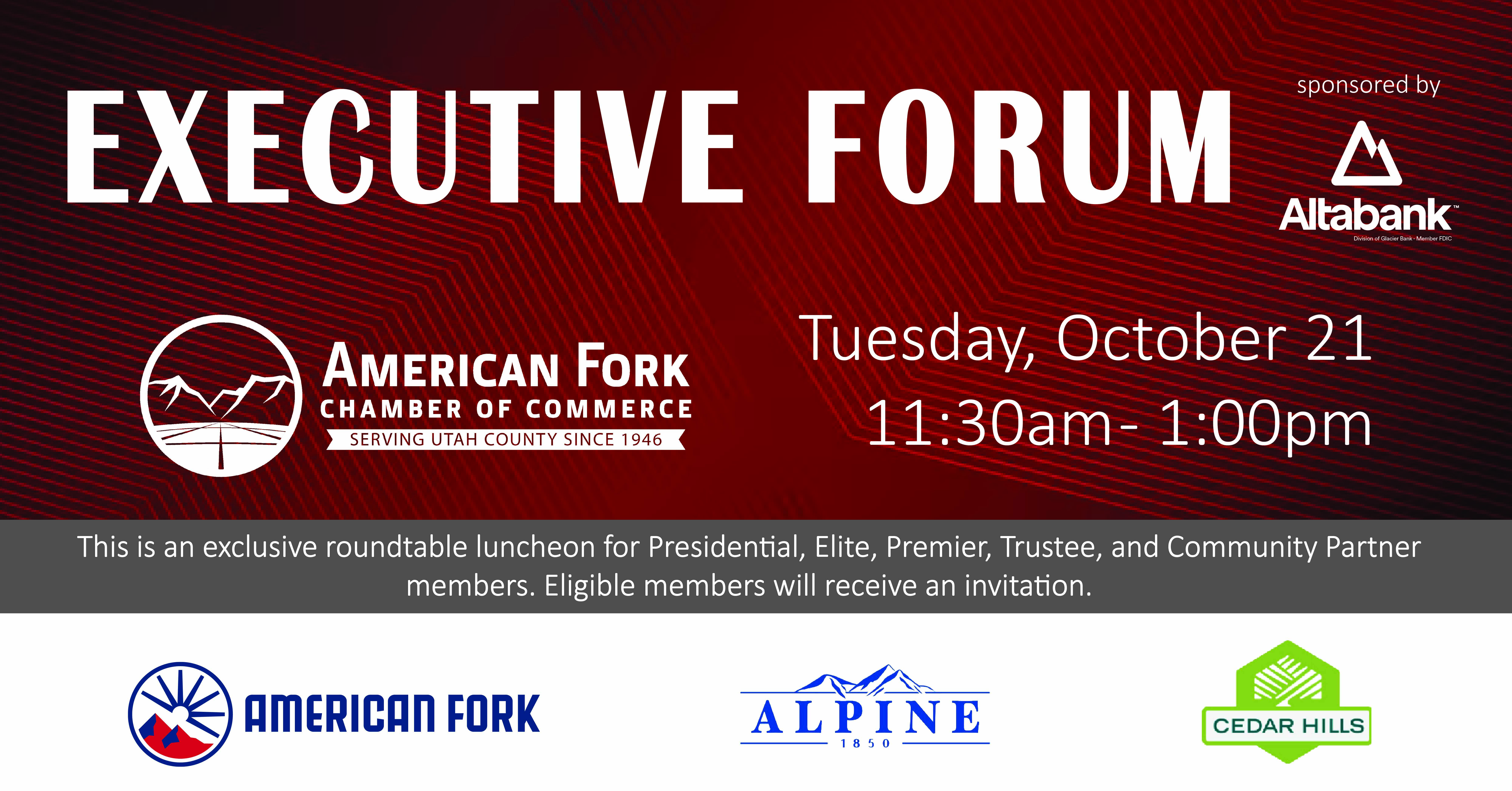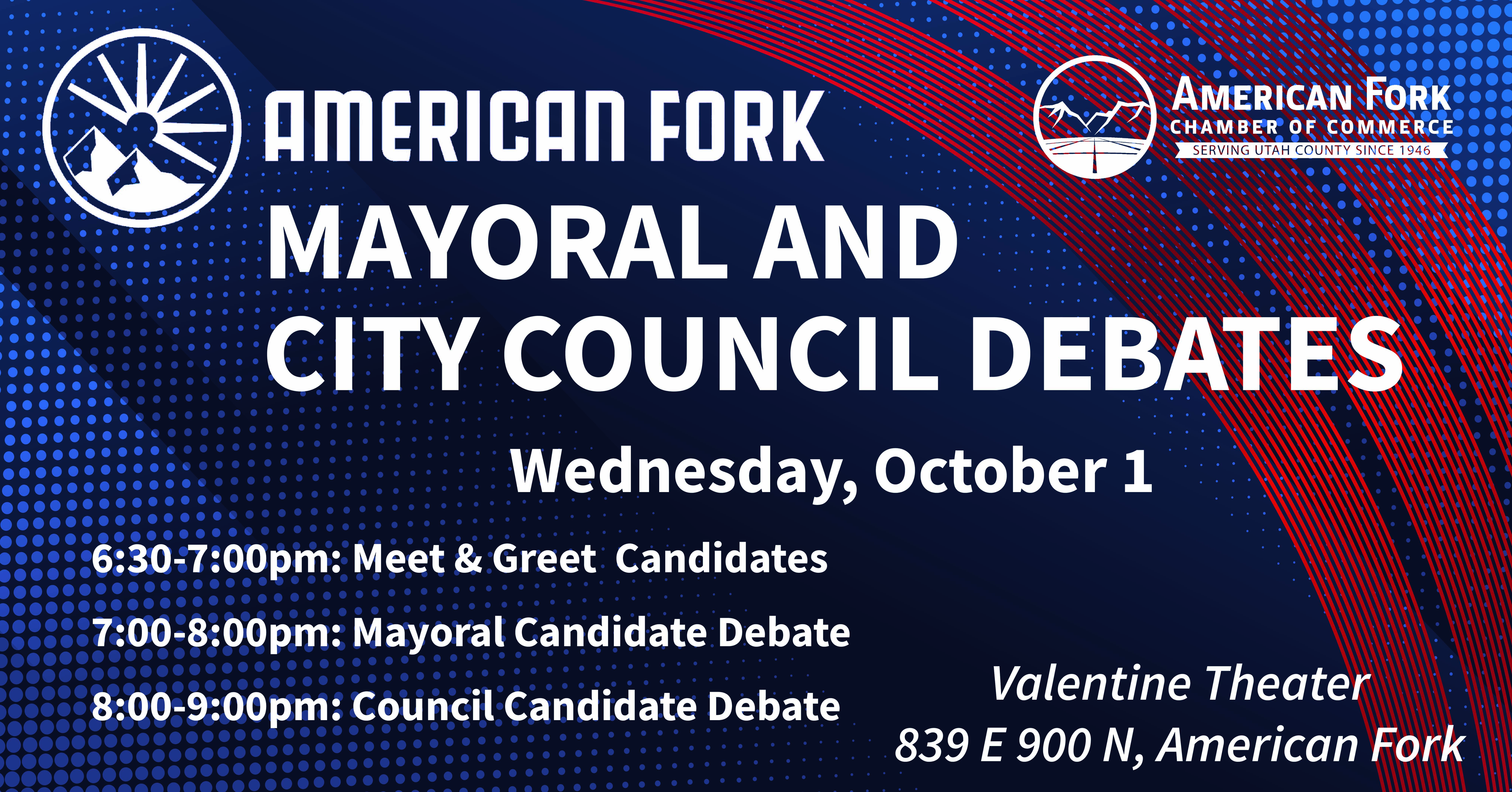 | 10/1/2025 | The American Fork Chamber of Commerce invites you to an important evening of civic engagement! Come hear directly from the candidates running for Mayor and City Council in American Fork. This is your chance to meet them face-to-face, ask questions, and learn where they stand on the issues that matter most to you, your family, and your business. This free community event is open to all residents, businesses, and community members. Make your voice count by being informed before you cast your ballot. more info... |