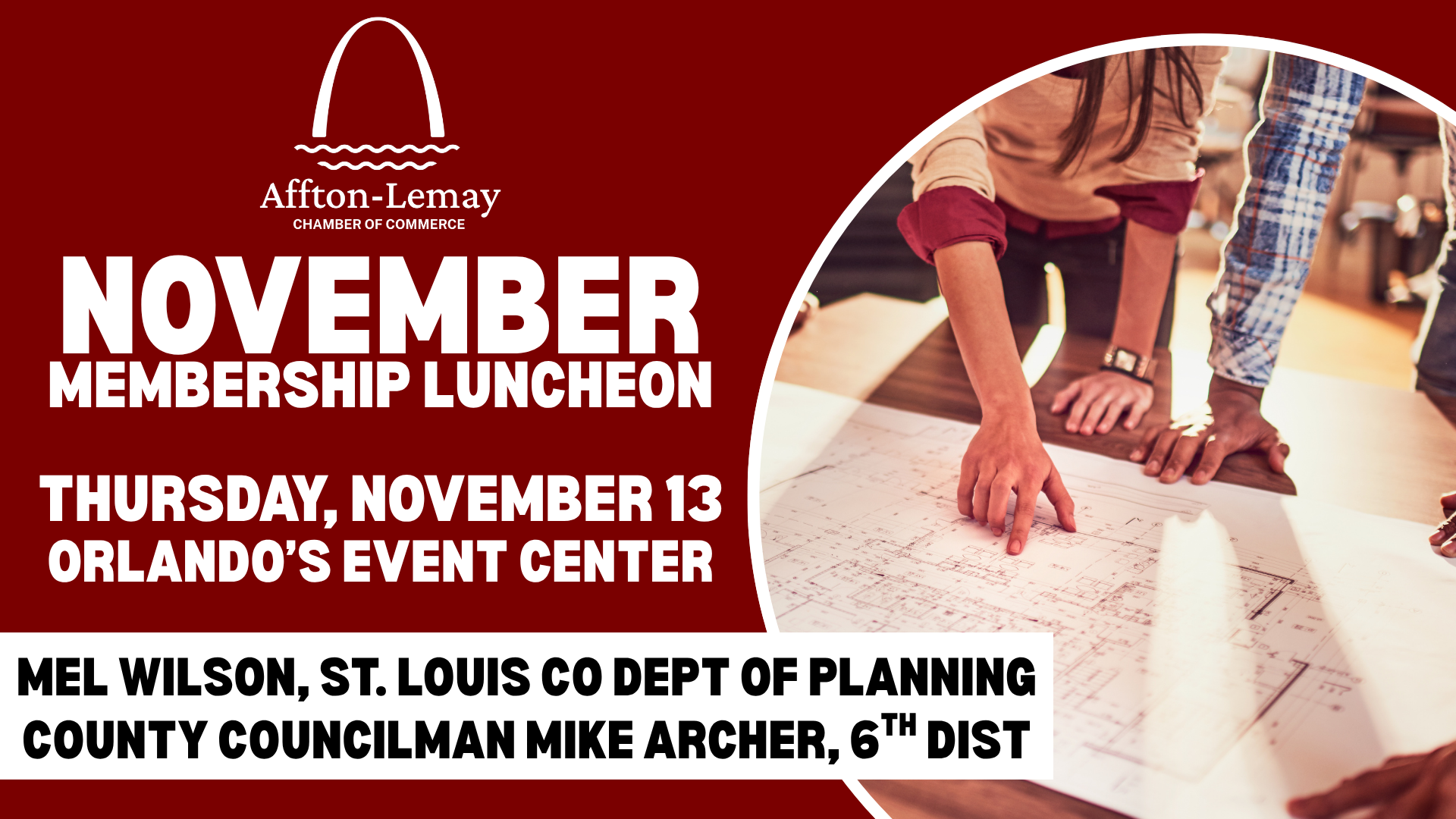 | 11/13/2025 | 11:15 am Registration | 11:50 am Lunch $20 Affton-Lemay Members | $25 Non-Members Please register by November 7. Join us for our upcoming meeting featuring two key representatives shaping our region’s future: Mel Wilson, Deputy Director of the St. Louis County Department of Planning, and St. Louis County Councilman Mike Archer of the 6th District. Mel Wilson will provide an update on the St. Louis County 2050 Comprehensive Plan, sharing insights into the county’s long-term vision for growth and development. Councilman Archer will follow with a brief update on initiatives and issues affecting the 6th District. This meeting offers an excellent opportunity to stay informed about planning efforts and local government updates that directly impact our community. Sponsored by: more info... |