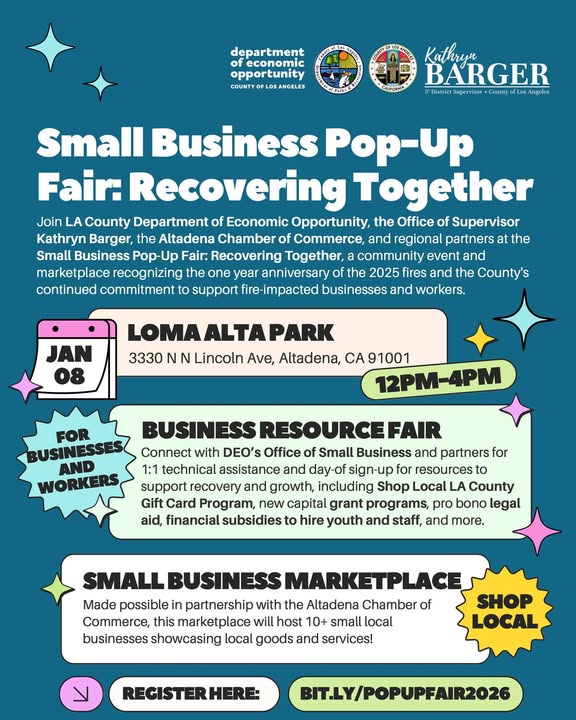 | 1/21/2026 | Join Us for “Rebuilding Altadena” - bringing back small business Visa and Bank of America invite you to “Rebuilding Altadena”, a free event created to help local small business owners rebuild, reopen, and grow stronger after the Eaton Fire. Join us on January 21, 2026, at Alta Design Works. Whether you stay for a few minutes or a few hours, you’re welcome to stop by anytime between 11:00 AM and 4:00 PM to meet experts offering resources, tools, and personalized advice on financial recovery, business growth, marketing, and more. You’ll also meet fellow entrepreneurs, with SCORE and other local partners on site to help you network and share your experiences. Enjoy complimentary food and drinks from Altadena’s own local vendors as we come together to celebrate the resilience and creativity that define our community. Let’s rebuild, reimagine, and revitalize Altadena — one small business at a time. Register for free here: https://gems.bankofamerica.com/public/RegisterForEvent.do?dispatch=checkRegistrationStatus&site=client&eventId=UGoLr9XXO24=#/overview more info... |