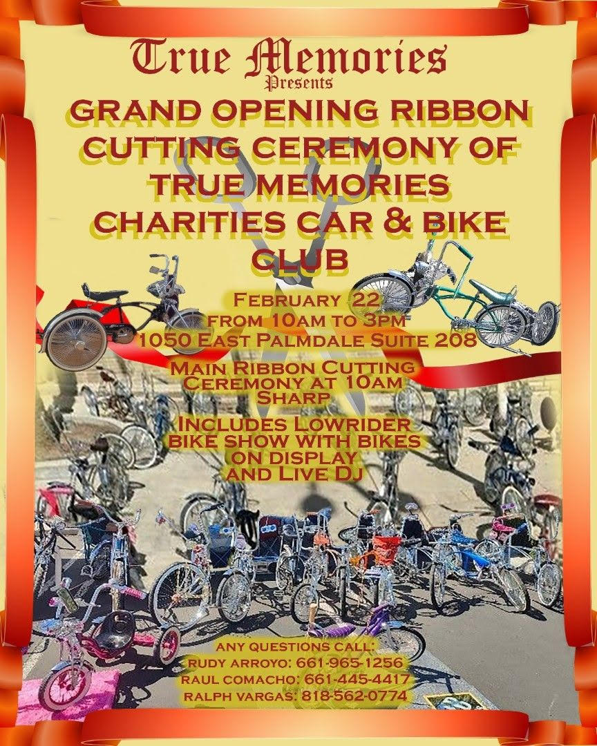 | 2/22/2025 | 🚗🎉 Get Ready for an Unforgettable Event! 🎉🚲 🎀 Ribbon Cutting Celebration 🎀 📢 True Memories Charities Car and Bike Club 📅 Date: SATURDAY, February 22, 2025 🎧 What's Happening? 🎧 🌟 Let’s make memories together, show love for the community, and enjoy a day of fun and excitement! 🌟 💌 Don’t miss this amazing celebration – it’s one for the books!