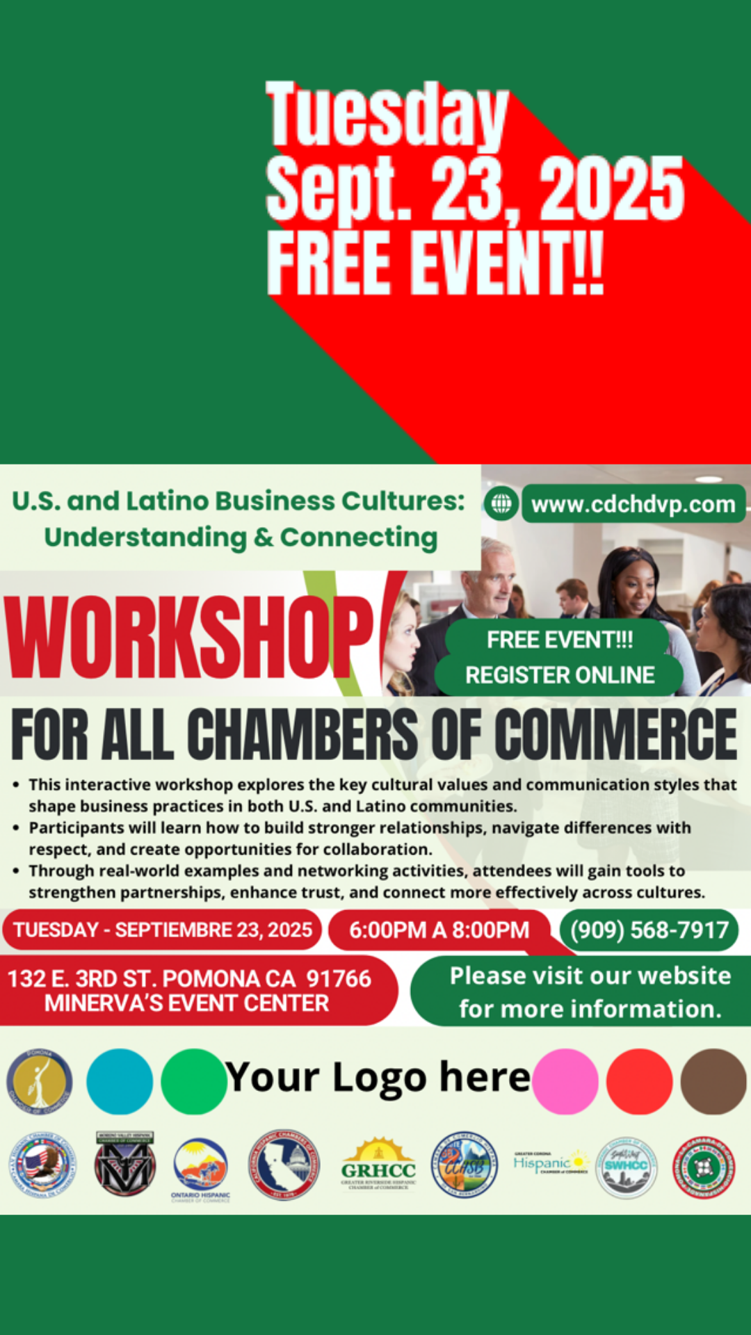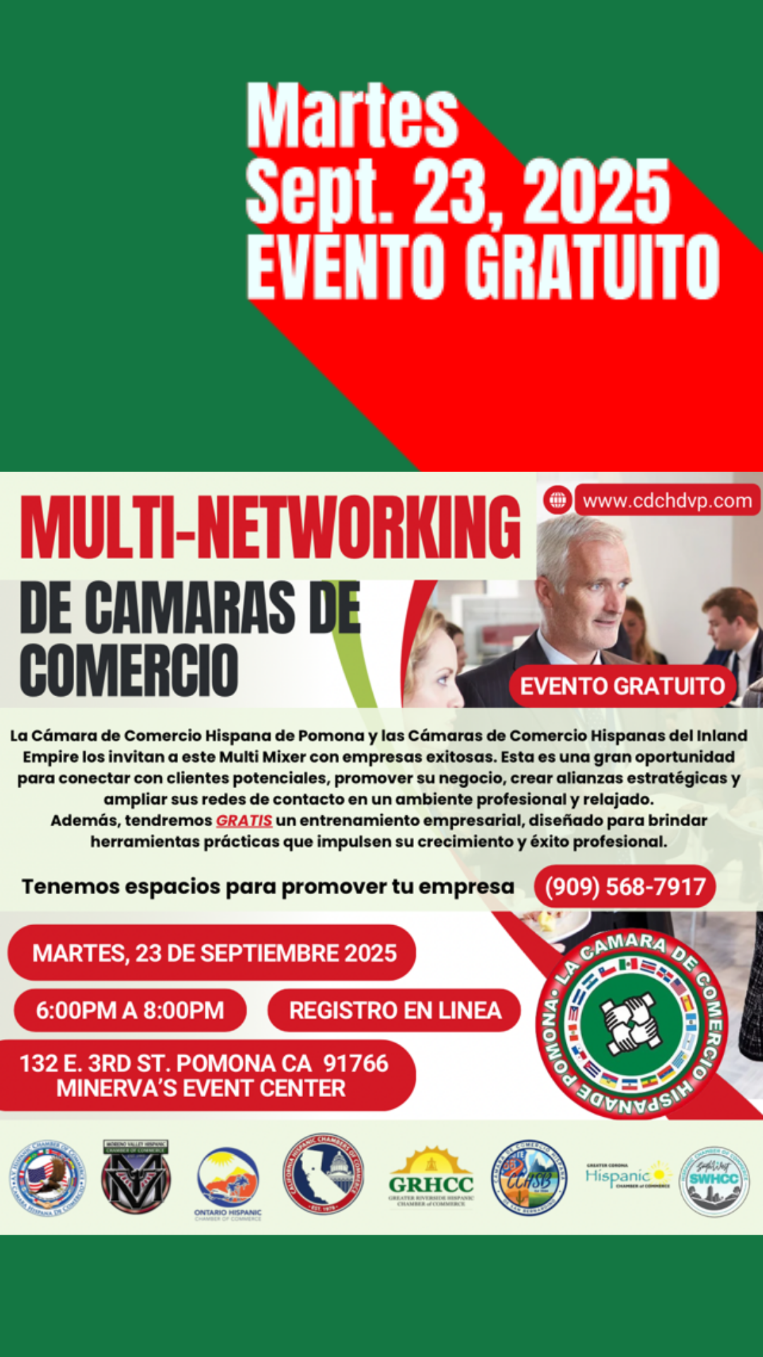 | 9/23/2025 | FREE WORKSHOP FOR ALL CHAMBERS REGISTER ONLINE! https://lp.constantcontactpages.com/ev/reg/a2ymat4 Sept. 23, 2025 (Tuesday) 6:00 PM - 8:00 PM Evento de AprendizajeEntrada Gratis Para El Publico y Miembros Ubicación: “Minerva’s Event Center / Juan Pollo Banquet Hall” Comienzo; 6:00PM - 8:00PM Próximo REUNION: Martes, 23 de Septiembre 2025 more info... |