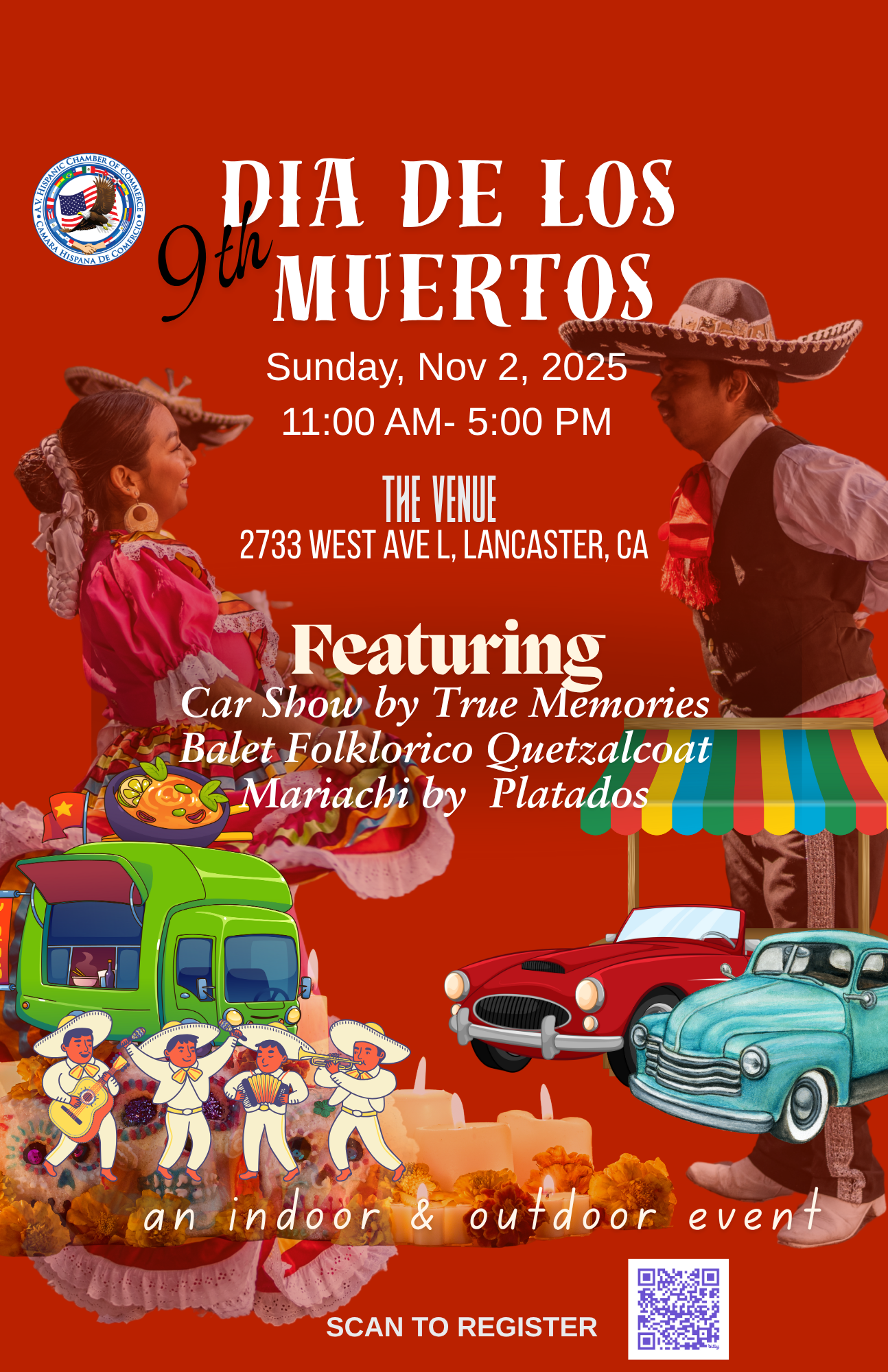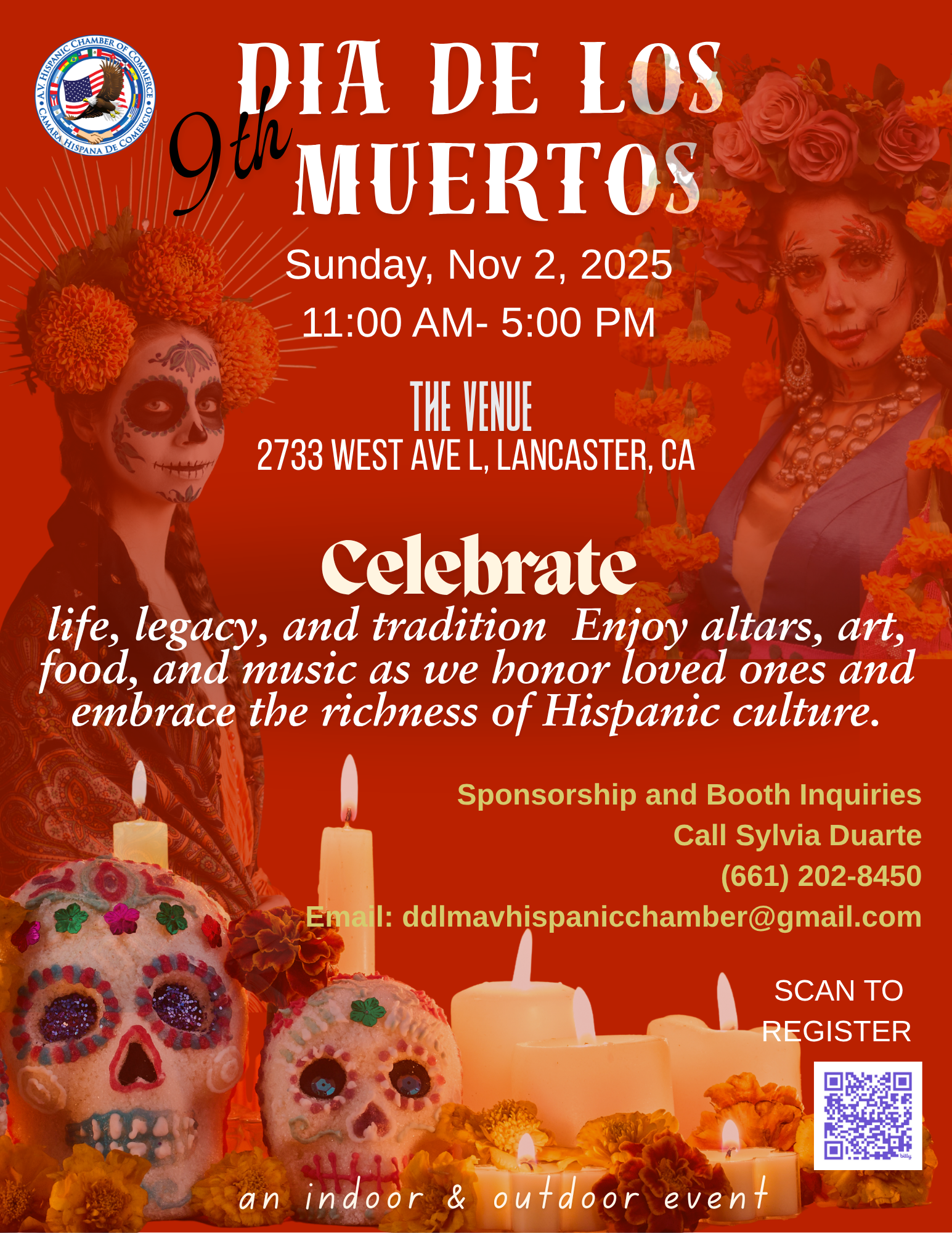 | 11/2/2025 | 🌺 9th Annual AVHCC Día de los Muertos Celebration 🌺 Join the Antelope Valley Hispanic Chamber of Commerce for our 9th Annual Día de los Muertos Celebration, Día de los Muertos (Day of the Dead) is more than remembrance—it is a joyful celebration of life, legacy, and connection. Families and friends gather to share stories, honor traditions, and celebrate the rich heritage and beauty of Hispanic culture. Features: