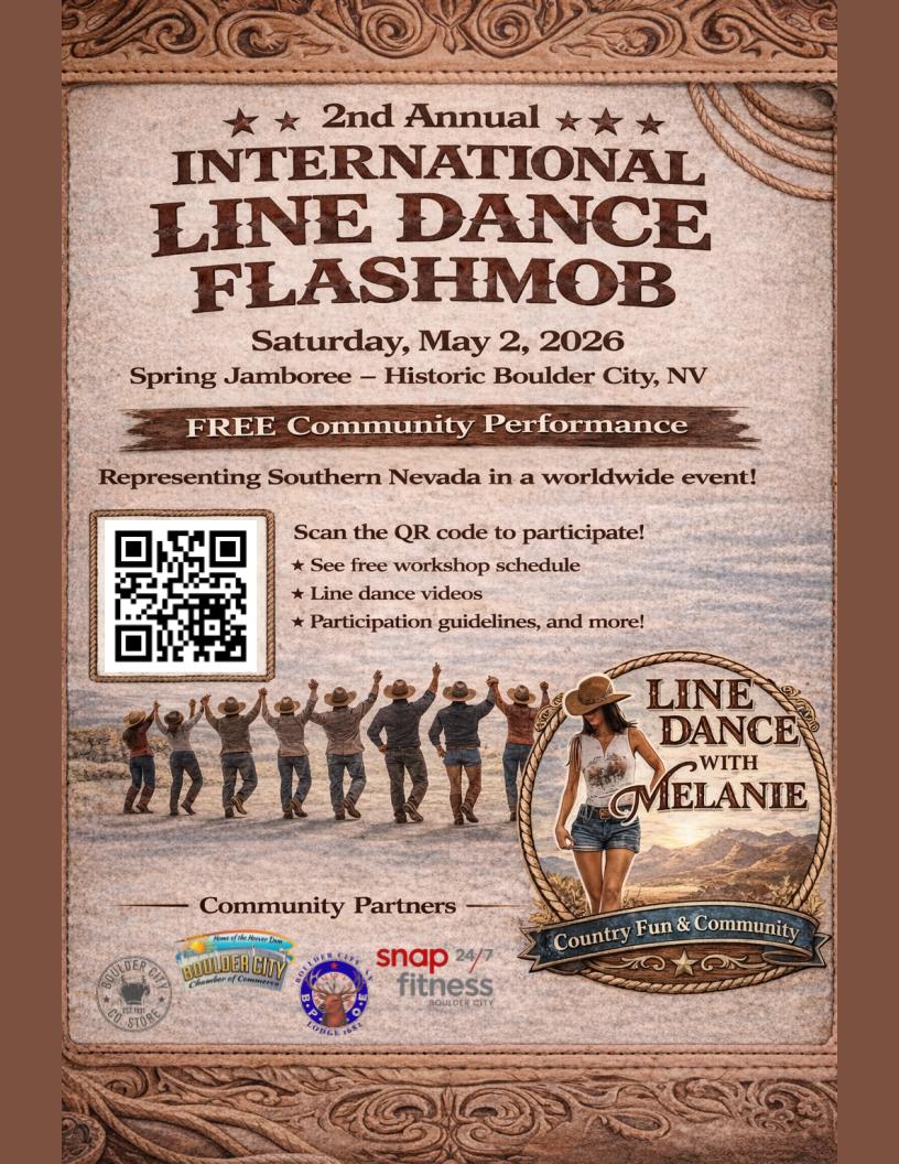 | 5/2/2026 -5/3/2026 | Spring Jamboree is an outdoor festival held in glorious clean green Boulder City near City Hall in Bicentennial Park, Wilbur Square, and Escalante Parks. This event is the major fundraising event for the Boulder City Chamber of Commerce and is filled with Arts, Crafts, Antiques, Music, Little Miss and Mister Pageant, Song, Dance, Mini Carnival rides, Bark in the Park, Rock and Gem Show, Classic Cars and local Business. This year will prove to be another weekend full of fun and laughter along with spectacular arts and crafts. And we must not forget the wonderful food we enjoy during any affair in the park. more info... |