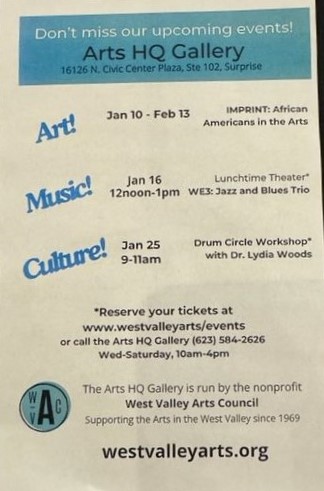 | 1/25/2025 | Ready for an exciting experience? Grab a friend and reserve your seat for a powerful start to the new year! Dr. Lydia Woods, of Drum Arizona, will lead a hands-on drum circle workshop using African Djembe drums. Experience the moving beat of the Drum Circle while surrounded by artwork of local African American artists in our newest exhibit, IMPRINT: African Americans in the Arts. Engage your hands and your heartbeat in this thrilling workshop! All ages welcome. No experience is necessary. Details: When: Saturday, January 25rd from 9am-11am Where: Arts HQ Gallery | 16126 N Civic Center Plaza, Surprise, AZ 85374 Cost: $15 per ticket (drum to use is included for the session!) | ||||||