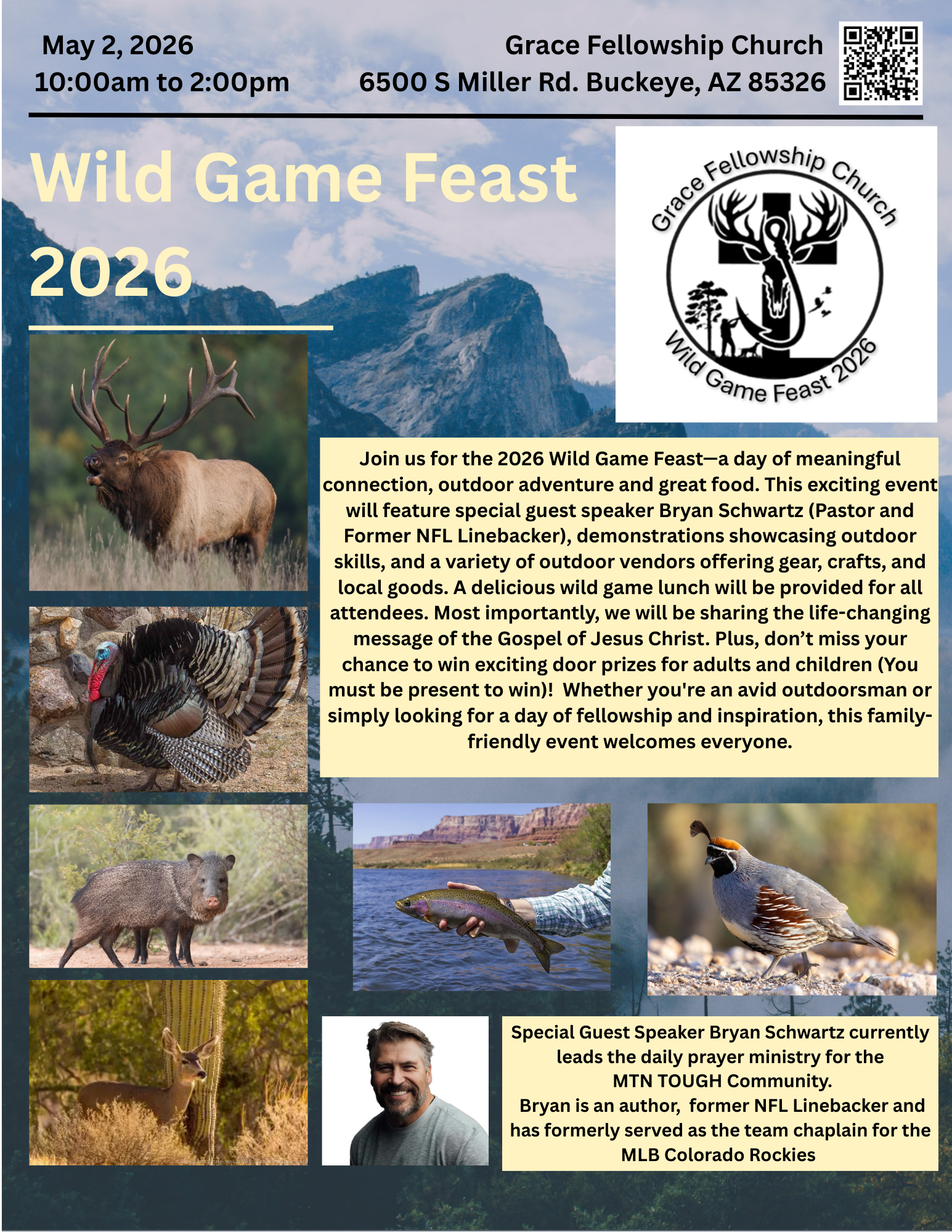 | 5/2/2026 | Support Grace Fellowship Church Wild Game Feast & Sportsman’s Expo Help Us Reach Outdoorsmen with the Gospel Wild Game Feast - Grace Fellowship Church Buckeye Dear Marketing Department, We are excited to announce our upcoming Wild Game Feast and Sportsman’s Expo at Grace Fellowship Church, and we would love to invite your support for this special event! Our Mission is to spread the Love of Jesus to the sportsman’s community. During the expo we will be having outdoor demonstrations a wild game lunch, along with special guest speaker Bryan Schwartz (Pastor and former NFL Linebacker) we will host a raffle for those who attend, and we are currently seeking donated items or gift baskets to include in the raffle. We will be having an additional raffle for the children who are in attendance. All donors will be recognized at the event, and it’s a great way to promote your business or organization while supporting a meaningful cause. Additionally, we are offering booth space at the expo for those who would like to showcase their products, services, or share outdoor and sportsman-related resources. If you or your organization are interested in setting up a booth, we’d love to reserve a space for you. Booths can be rented for a fee of $75.00 for the day. Vendors must provide their own tables, chairs, canopies, and all necessary supplies. Buckeye Local Business's booth fee will be waved please put code buckeyebusiness in the coupon section on the payment page. We will provide our 501(c)(3) for tax-deductible donations and booth rent. Event Details: 📅 Date: May 2, 2026 📍 ⏰Time: 10am – 2 pm/ Booth Setup time 8:30 AM This event brings together families, outdoor enthusiasts, and members of our community for a time of fellowship, great food, fun – and your participation would make it even more meaningful! If you’re interested in donating a raffle item, reserving a booth or have any questions, please contact us at 623-393-8386 or by email at wgf@graceinbuckeye.com Please have donations arrive by April, 1 2026 Thank you for considering this opportunity to partner with us. We truly appreciate your support! Blessings, WGF Volunteer Grace Fellowship Church 6500 S Miller Rd Buckeye, AZ 85326 Wgf@graceinbuckeye.com |