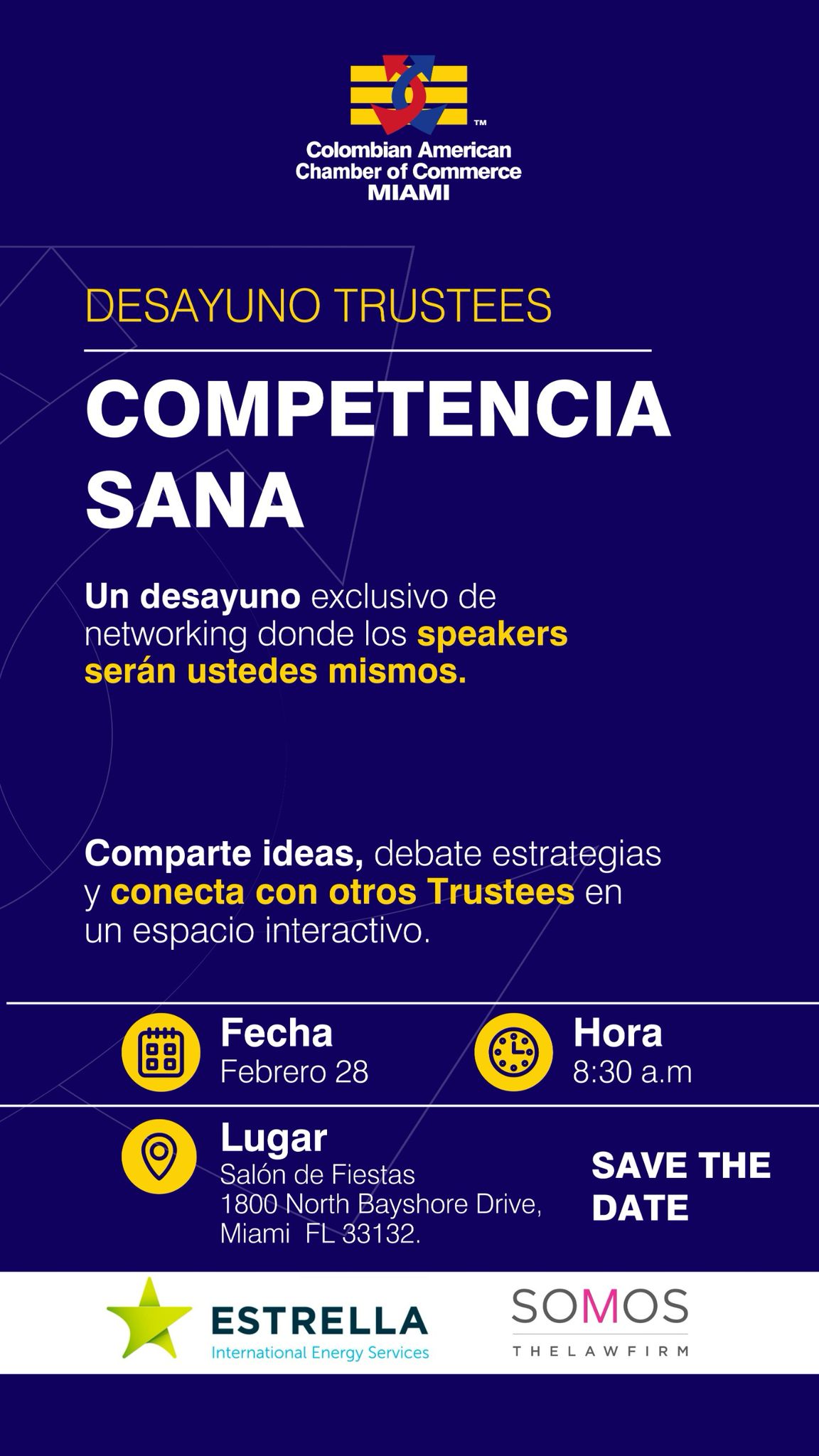 | 2/28/2025 | Estrella International Energy Services LLC y SOMOS the Law Firm lo invitan al primer Desayuno de Trustees 2025: "Competencia Sana", donde vamos a fortalecer la comunidad de miembros Trustee y fomentar conexiones estratégicas entre nosotros. Durante el evento, exploraremos los beneficios, privilegios y responsabilidades de los Trustee, conoceremos a otros miembros y nos daremos a conocer en un entorno relajado. Además, reflexionaremos sobre cómo apoyar a la Cámara a través de una “competencia sana”.